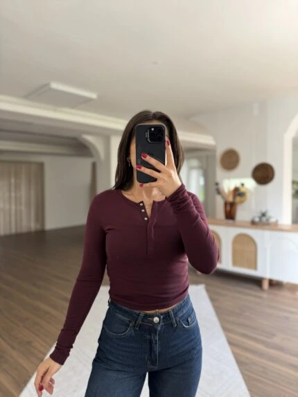 KOL VOLANLI GÖĞSÜ ÇİFT KAT MODAL PAMUK BLUZ – BORDO