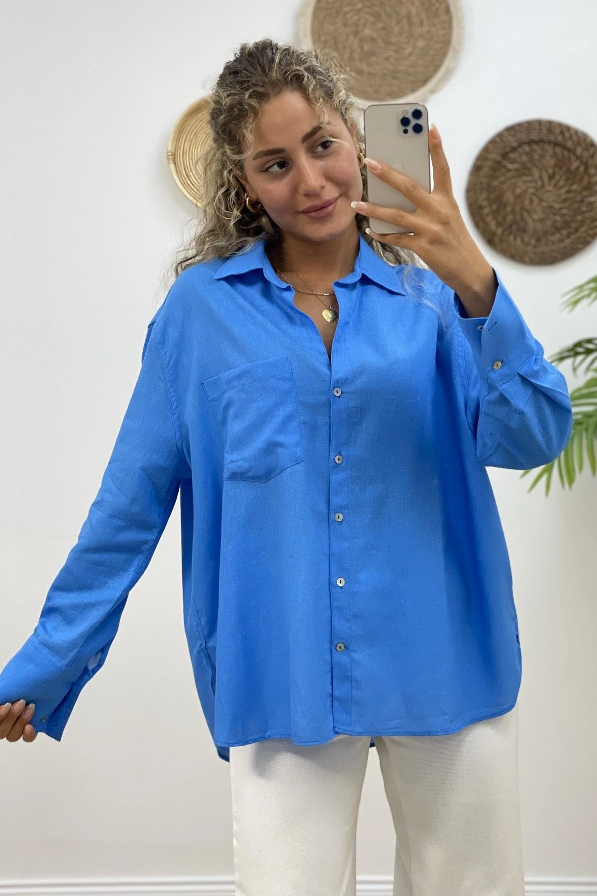 TAŞ BASKI DETAY PAMUK GÖMLEK – MAVİ