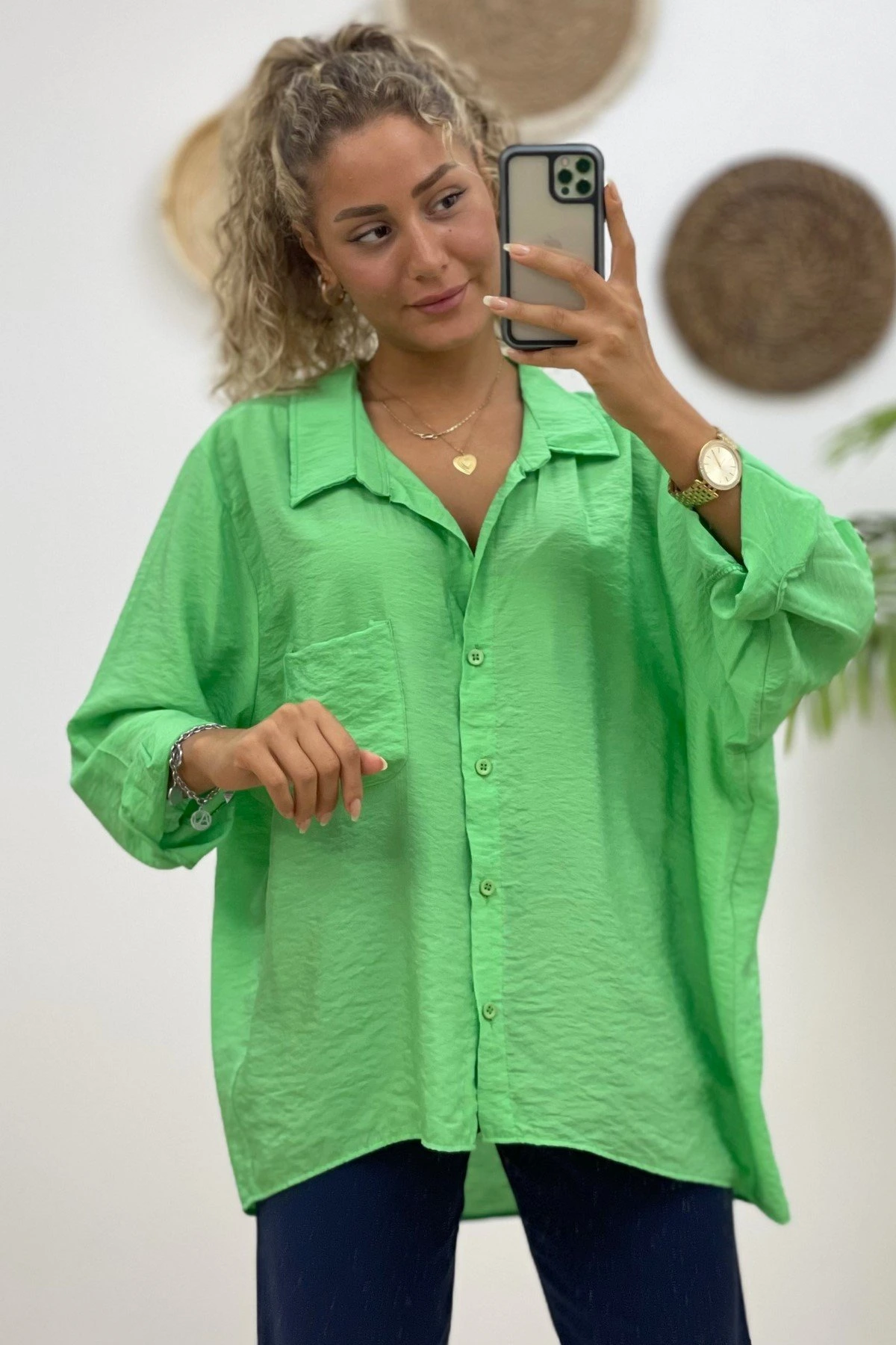 ARKA A PİLE DÜŞÜK OMUZ TEK CEP MODAL GÖMLEK – YEŞİL