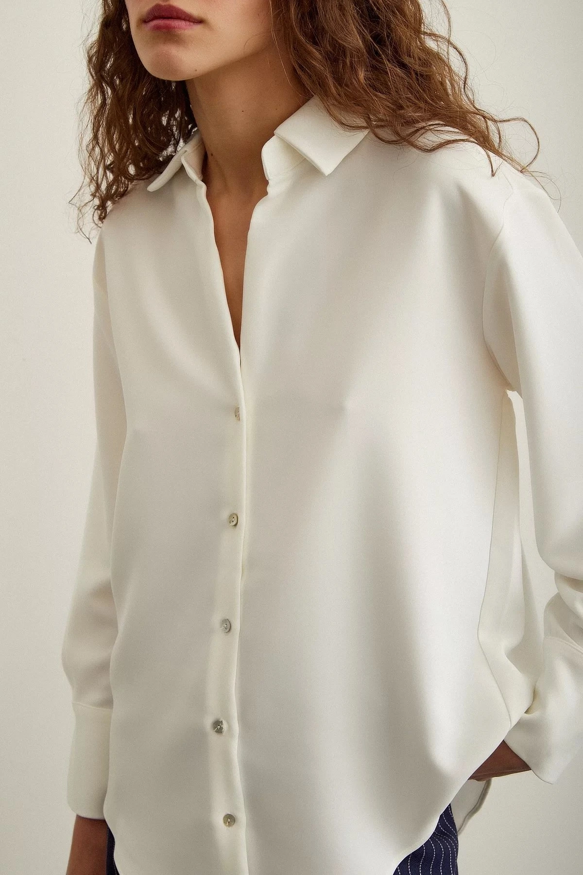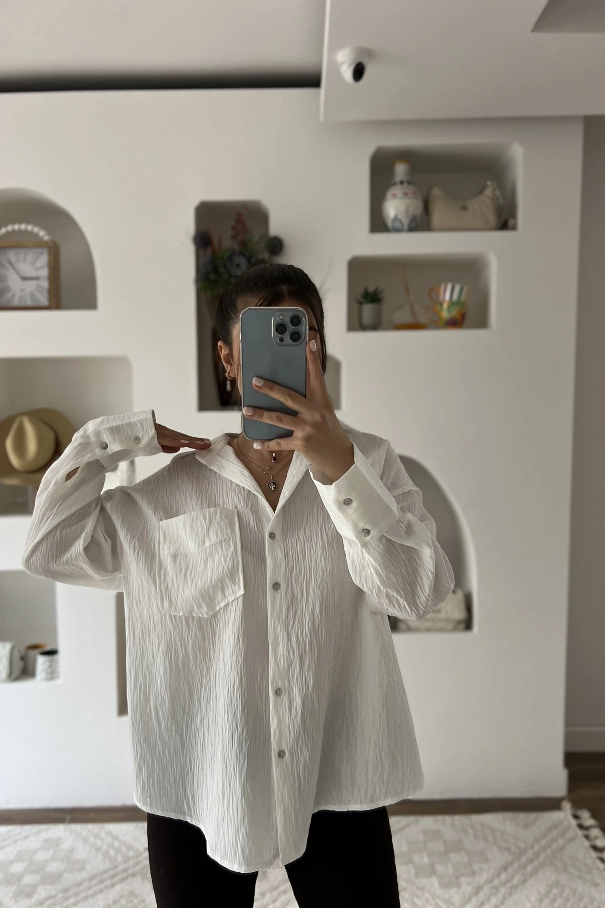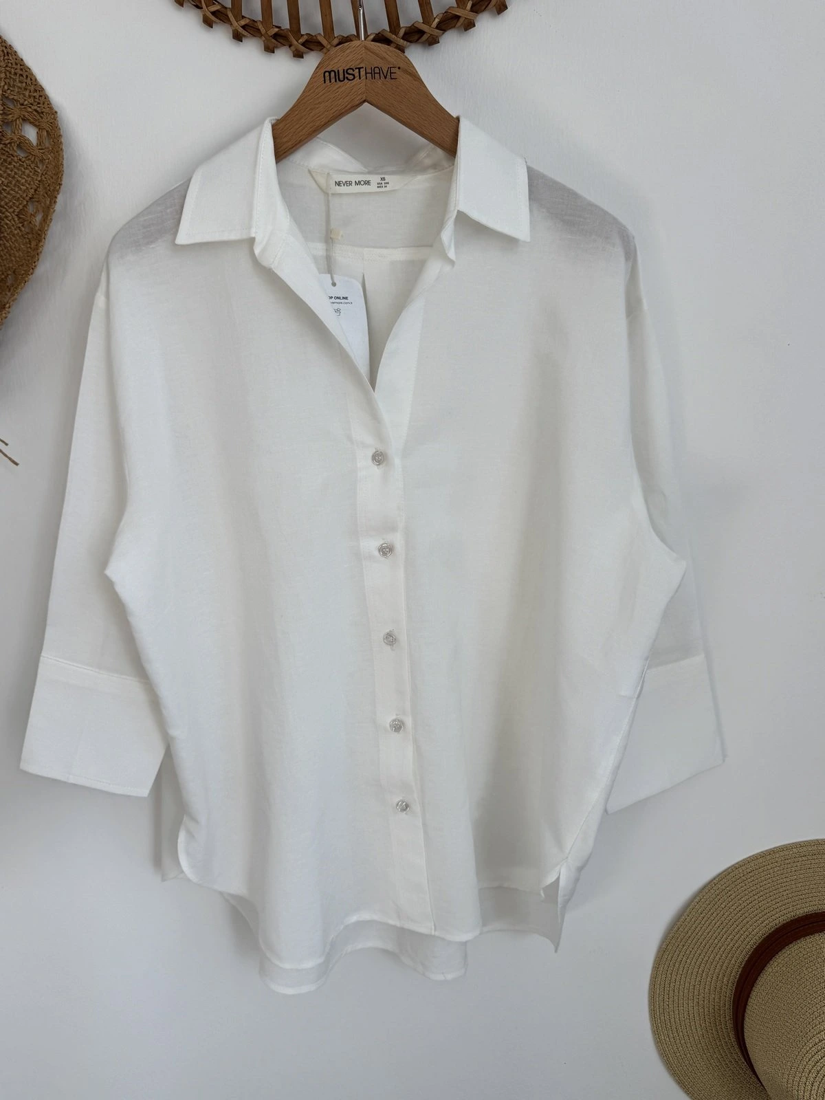 V YAKA KALIN PAMUK GÖRÜNÜMLÜ SEDEF DÜĞME GÖMLEK – EKRU