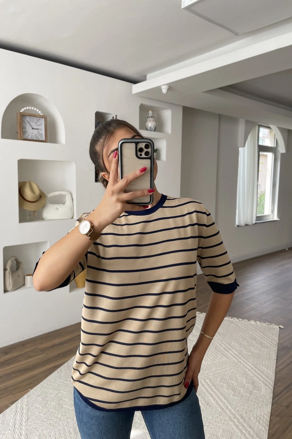 KUMAŞ DÜĞME ÇİZGİLİ GENİŞ MANŞET OVERSİZE VİSKON GÖMLEK – CAMEL LACİVERT