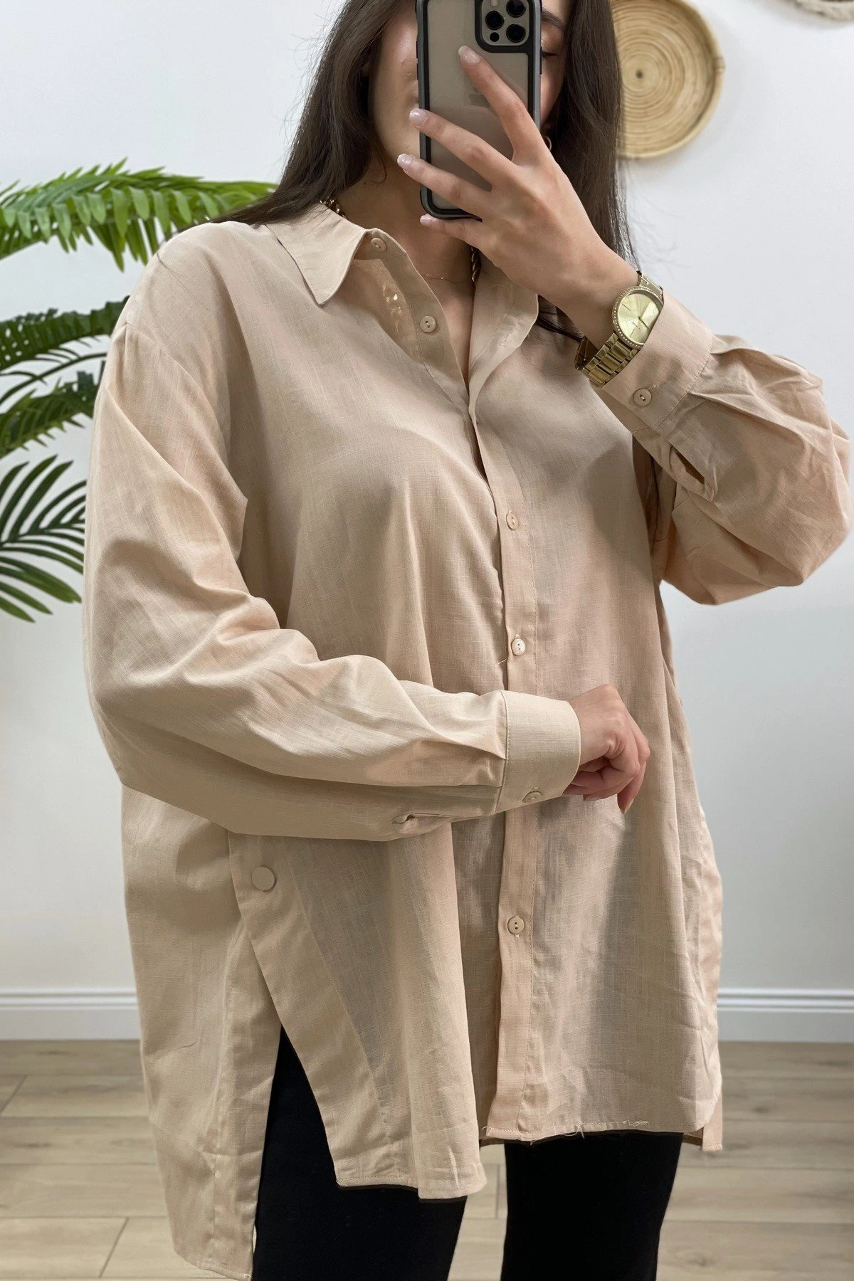 ÖN NAKIŞ VE BONCUK İŞLEME SALAŞ PAMUK GÖMLEK – AÇIK BEJ