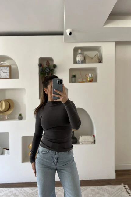 BİSİKLET YAKA PAMUK MODAL KARIŞIM CROP BLUZ – FÜME