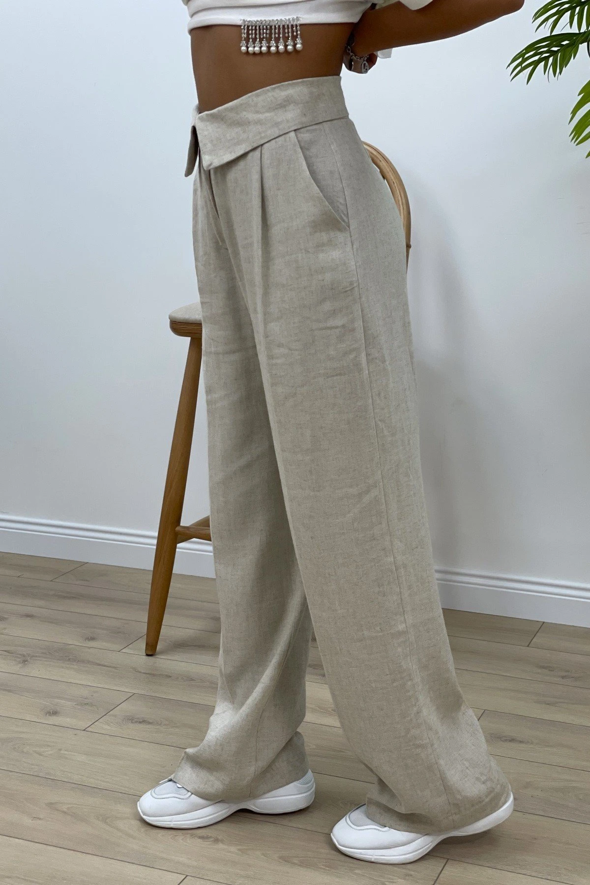 BEL LASTİK ASTARLI ÖN DİKİŞ KETEN PANTOLON – NATUREL
