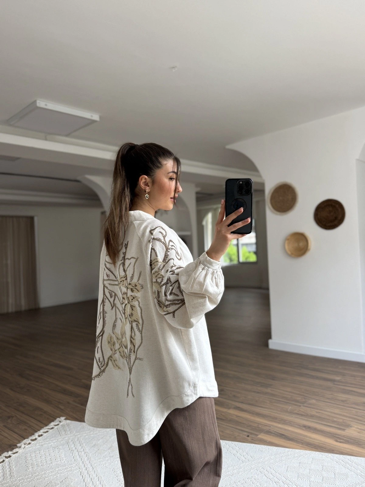 NAKIŞ İŞLEME İNCİ DETAY CEPLİ VİSKON KETEN PANTOLON – NATUREL