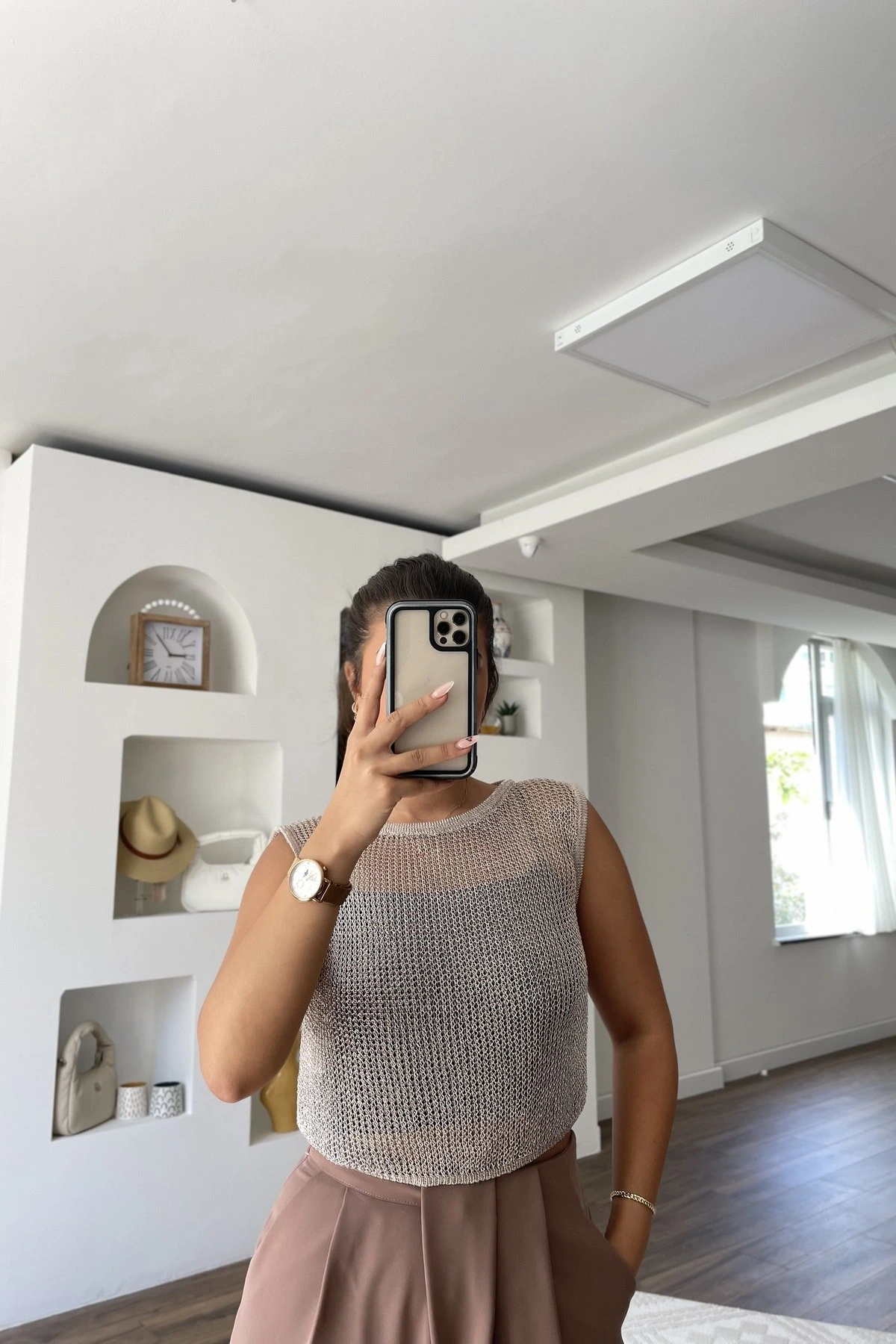 BİSİKLET YAKA AJURLU PARLAK KISA VİSKON BLUZ – PUDRA