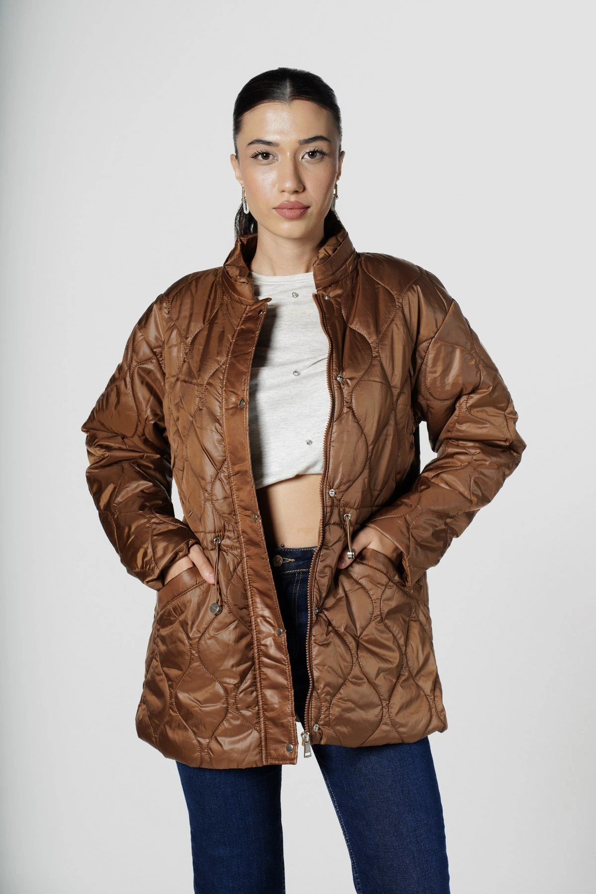 KAPÜŞONLU YAN CEPLİ BEL LASTİK PELUŞ MONT – TABA