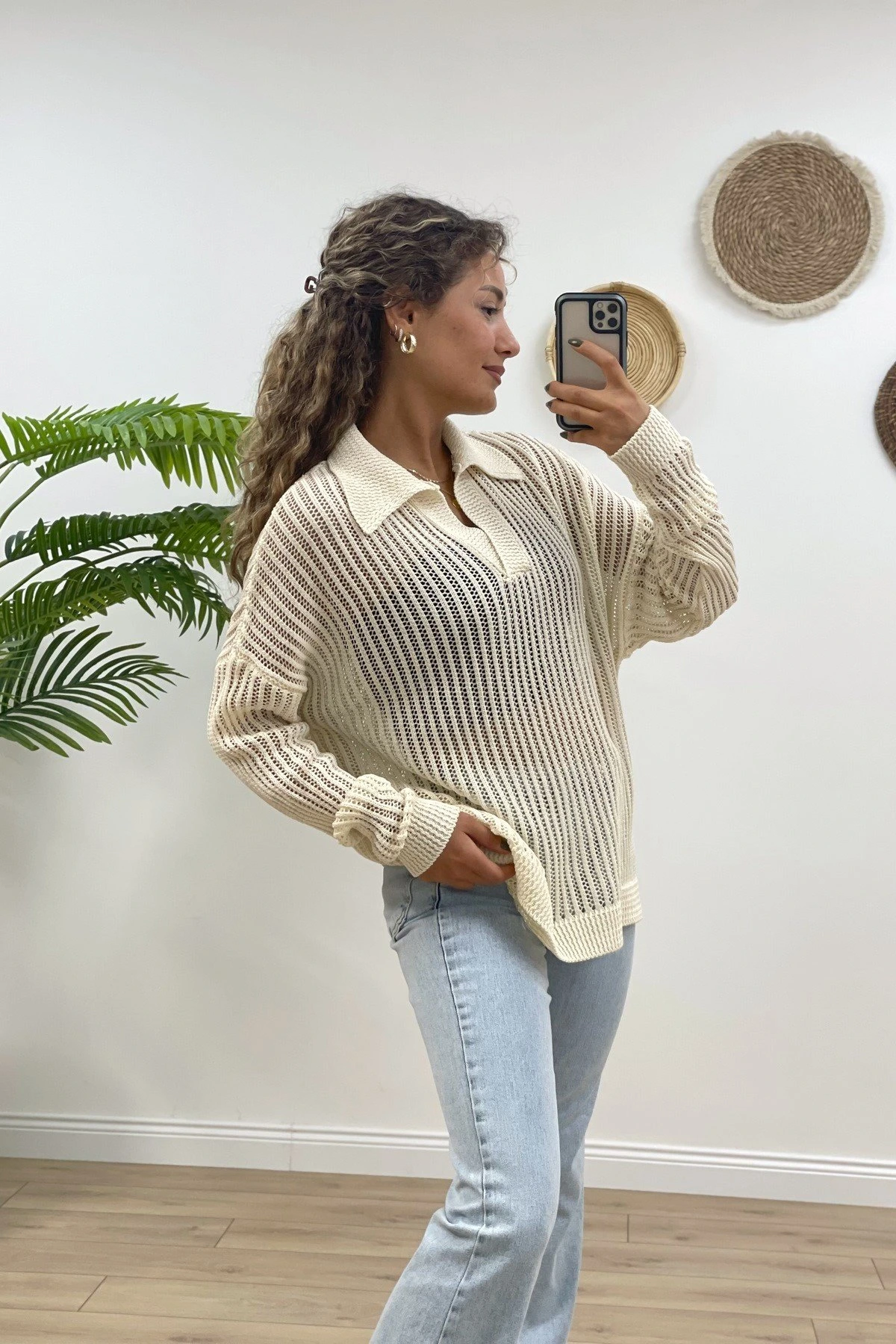 DİK YAKA FERMUARLI KAZAK – VANİLYA