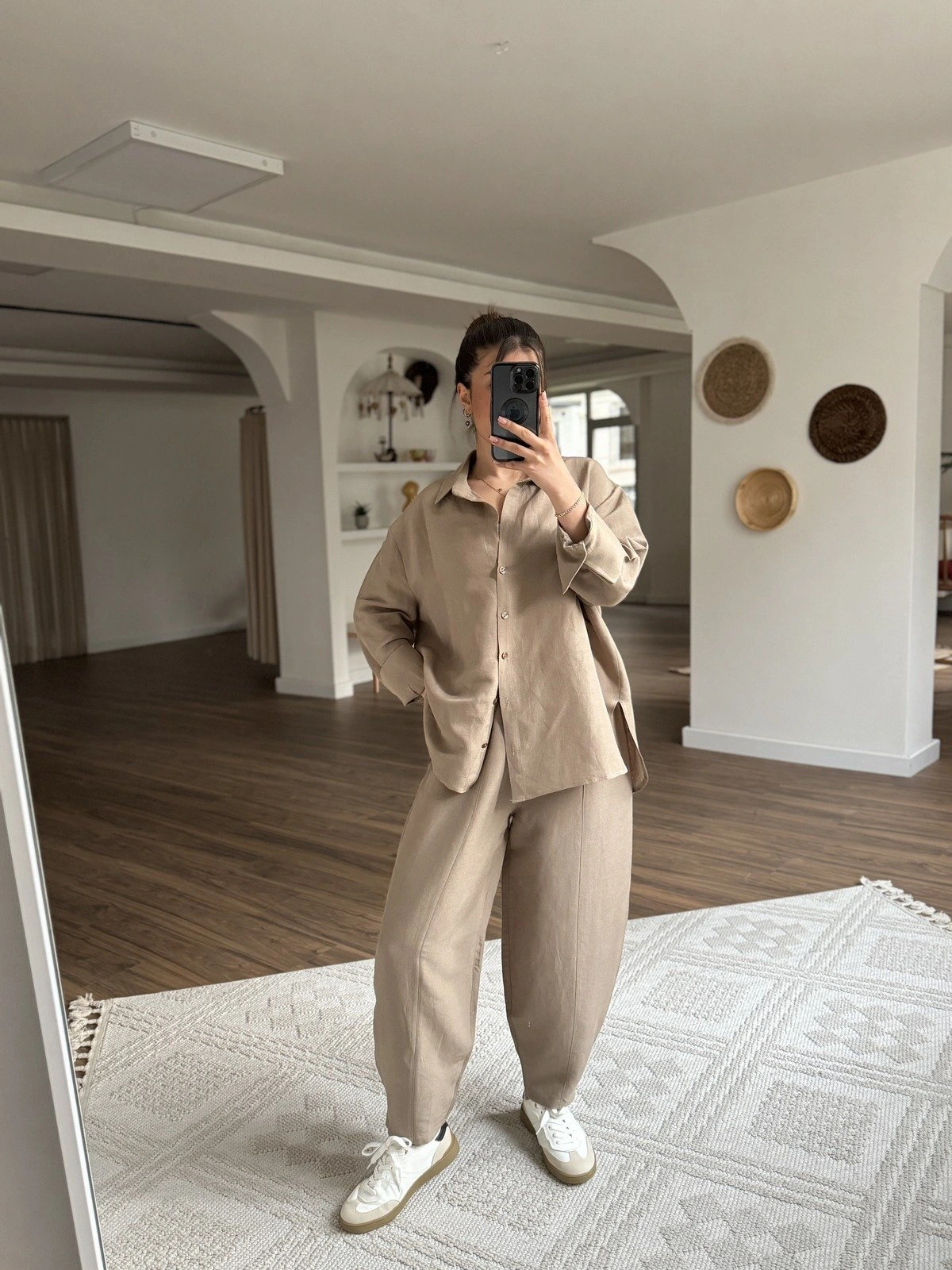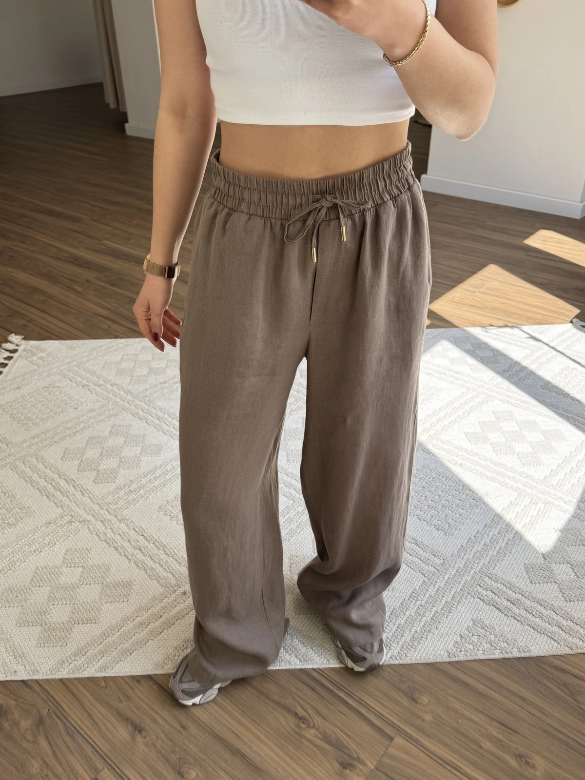 ARKA BEL LASTİK BOL PAÇA KETEN VİSKON PANTOLON – VİZON