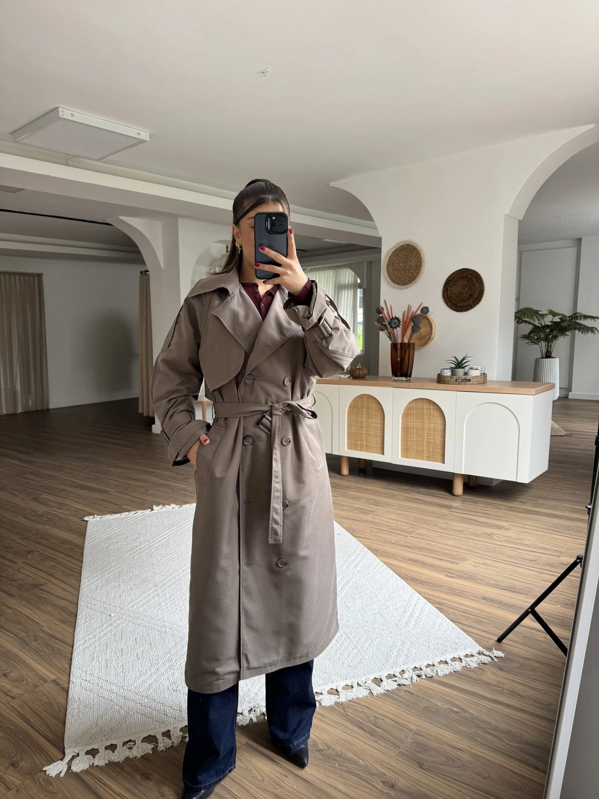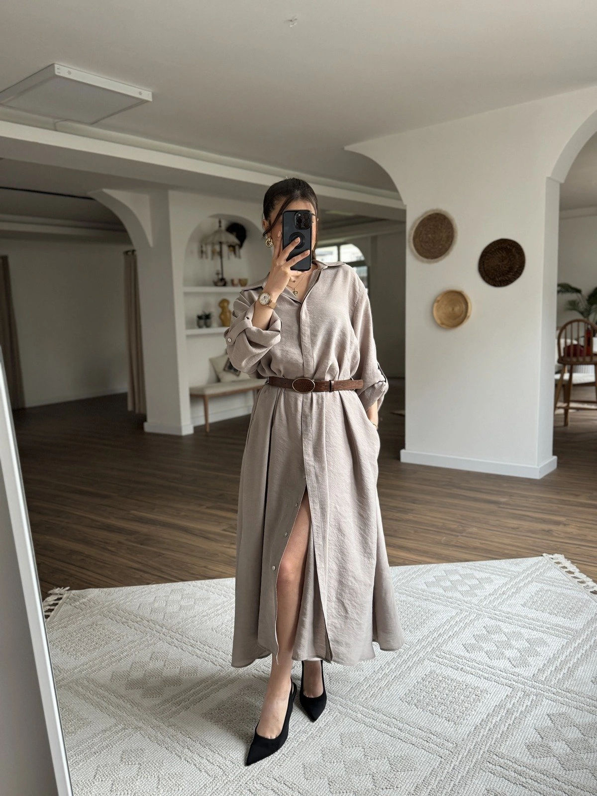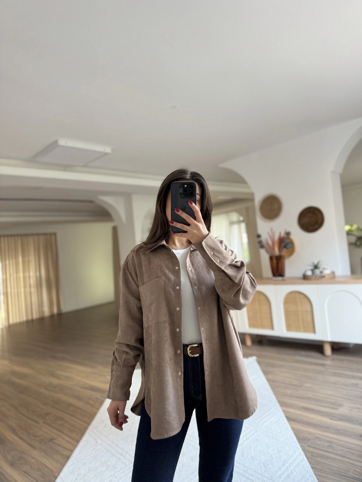 TEK CEP KUŞAKLI SÜET UZUN GÖMLEK – VİZON