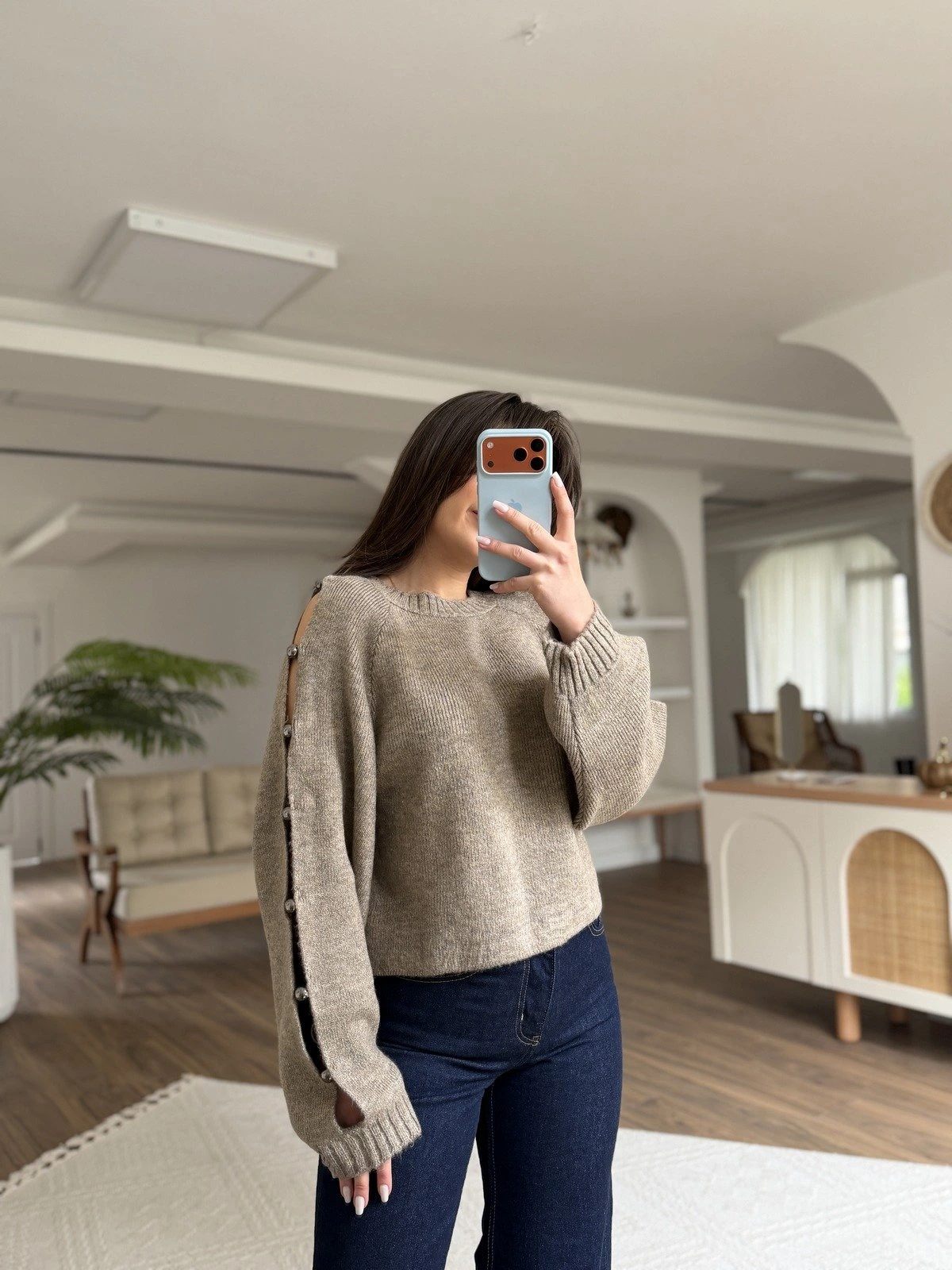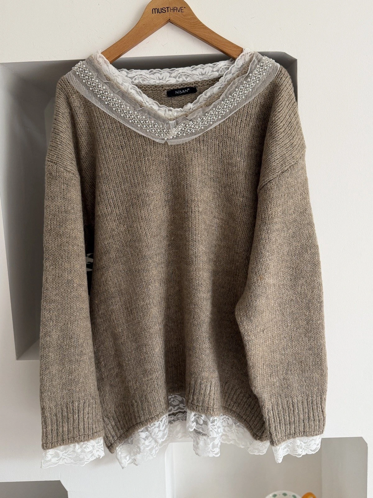 V YAKA BONCUK İŞLEME DANTEL DETAY KAZAK – VİZON