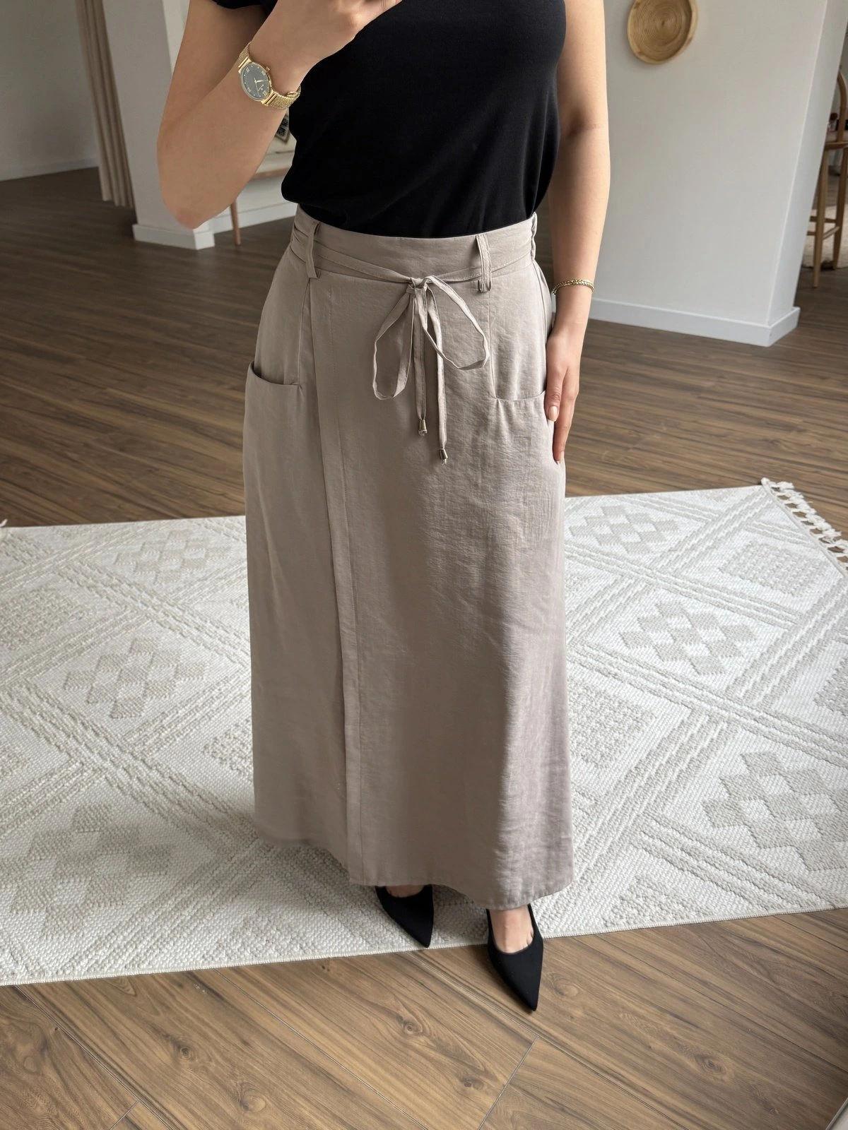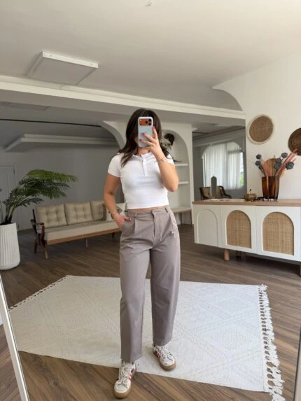 DOKULU CEPLİ BEL LASTİK VİSKON RAHAT PANTOLON – VİZON