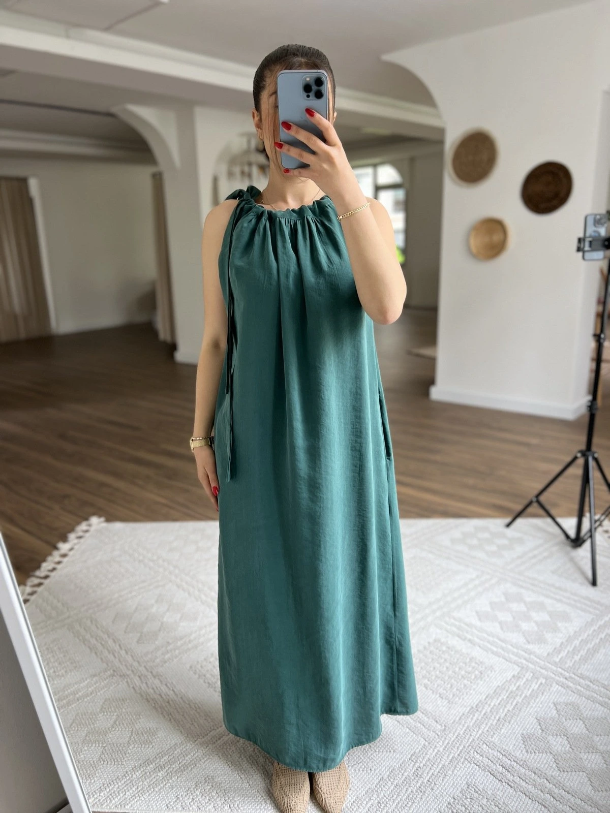 ARKA ÖN U YAKA VİSKON KARIŞIM UZUN KOLSUZ ELBİSE – ZÜMRÜT YEŞİL