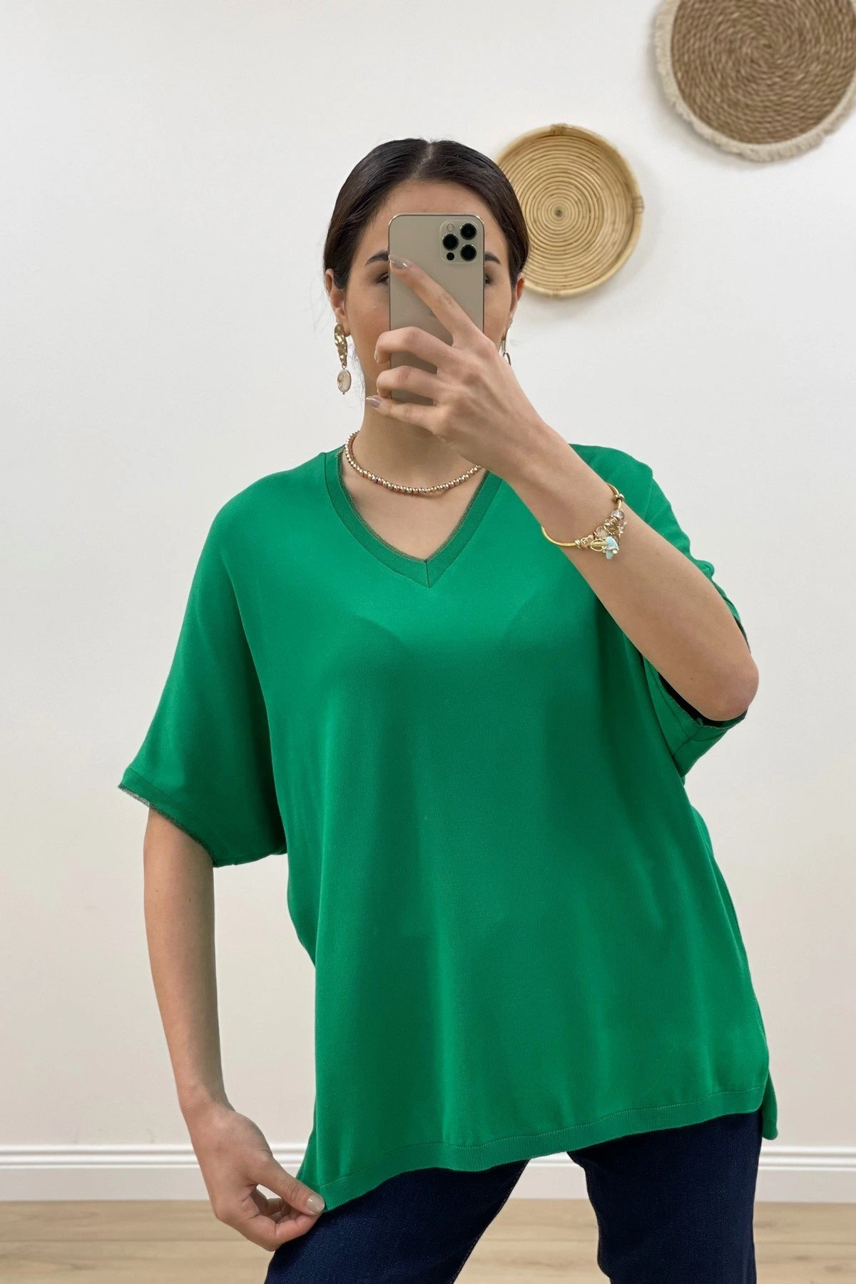 V YAKA BİLEK VE ETEK UCU YIRTMAÇLI TRİKO – ZÜMRÜT YEŞİL
