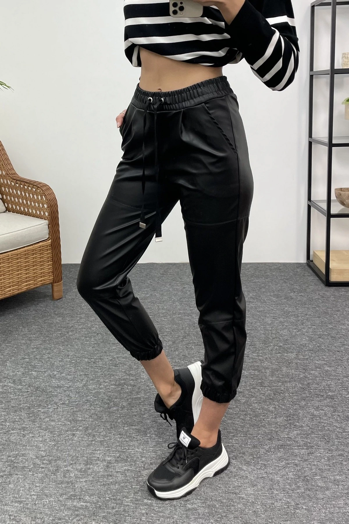 BEL VE BİLEK LASTİKLİ DERİ PANTOLON – SİYAH