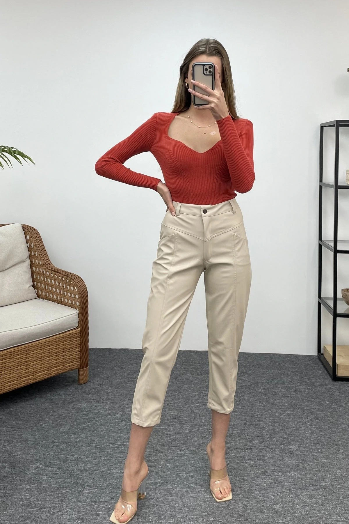 DİZ DİKİŞİ DETAY DERİ PANTOLON – KAHVE