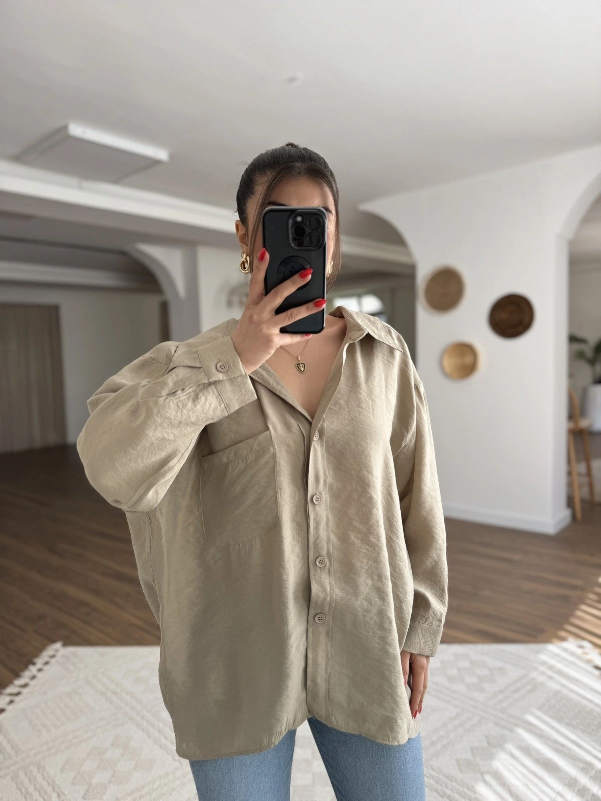 ARKA UZUN YAN YIRTMAÇ DESENİ İPEK VİSKON KETEN GÖMLEK – EKRU-KAHVE