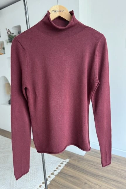 ETEĞİ ASİMETRİ SAÇ ÖRGÜ AJURLU KAZAK – BORDO