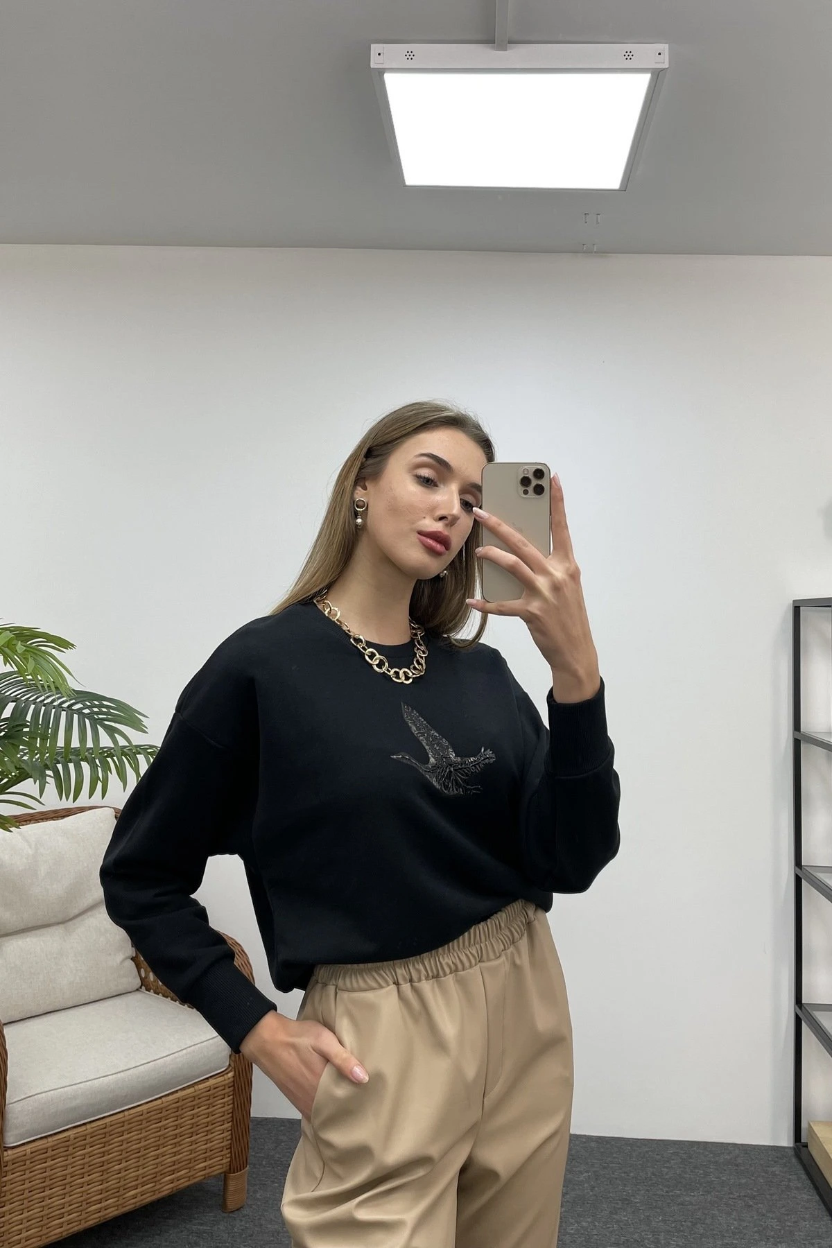 PARLAK KUŞ BASKI CROP SWEAT – SİYAH