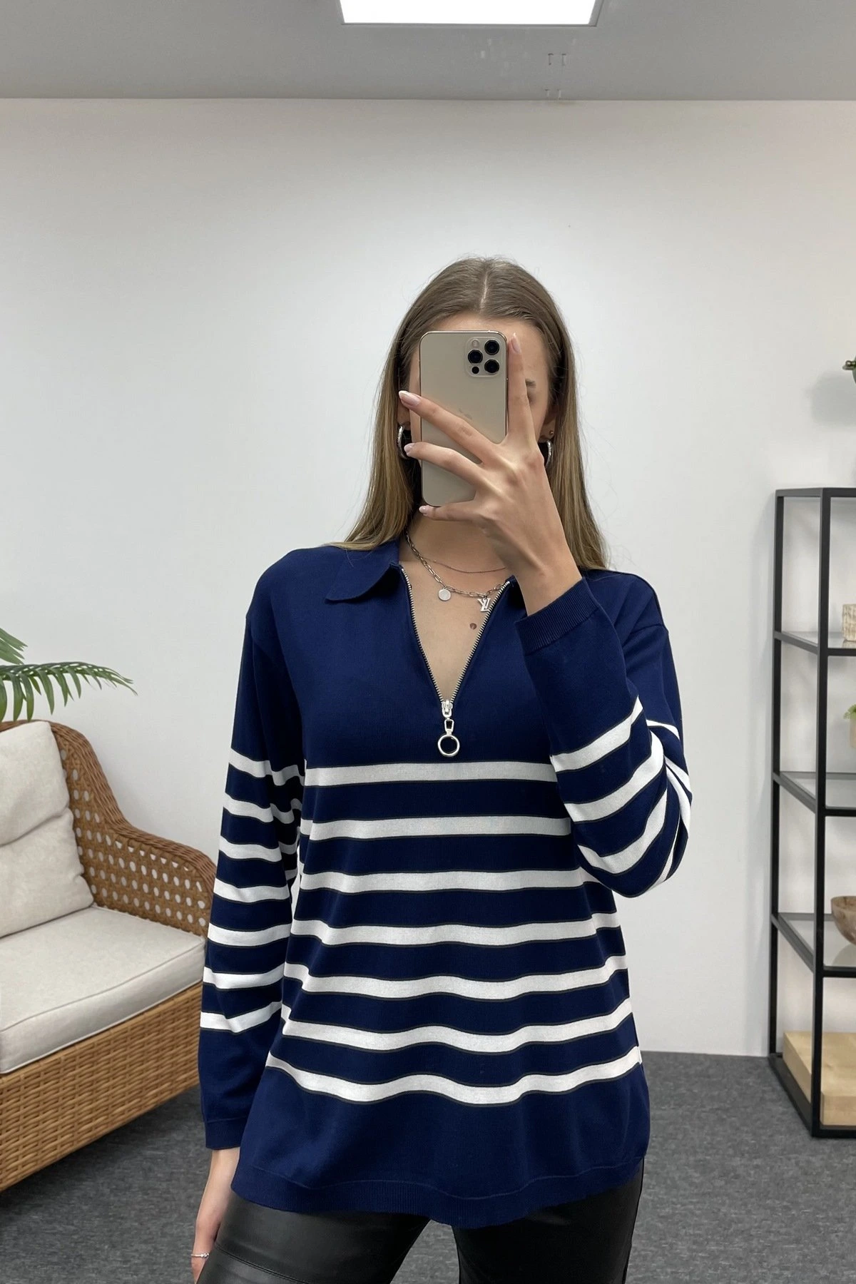 POLO YAKA ÇİZGİLİ FERMUARLI TRİKO – LACİVERT
