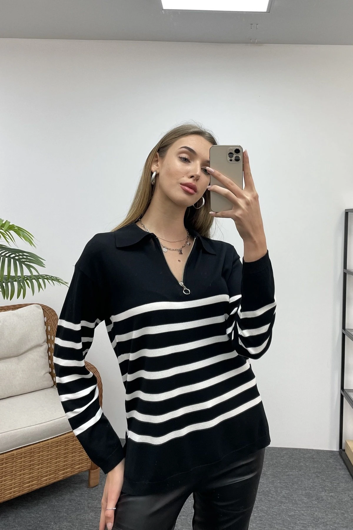 POLO YAKA ÇİZGİLİ FERMUARLI TRİKO – SİYAH