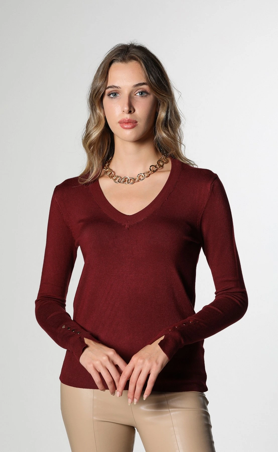 V YAKA KOL MANŞETİ DROPLU TRİKO – BORDO