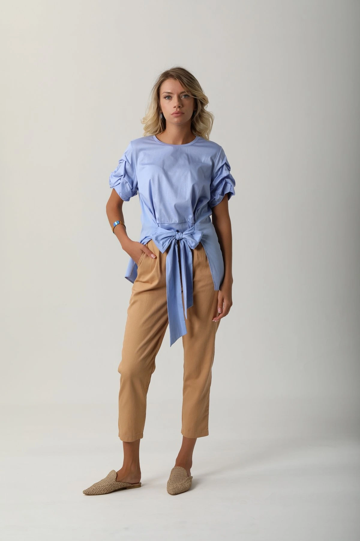İTHAL BEL KUŞAKLI ARKA YIRTMAÇ BLUZ – MAVİ