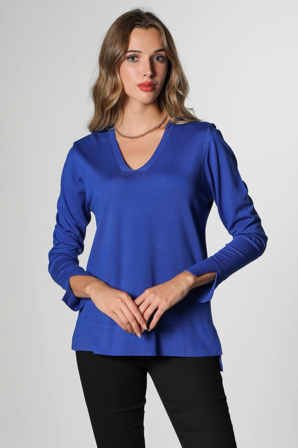 V YAKA BİLEK VE ETEK UCU YIRTMAÇLI TRİKO – SAKS
