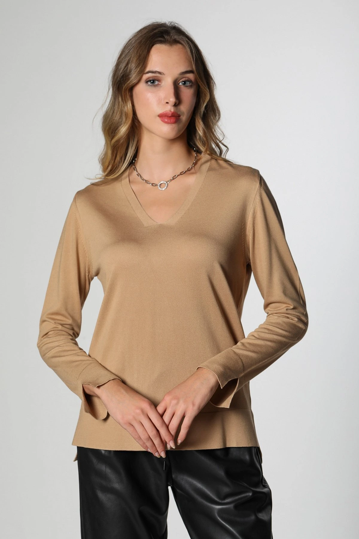 V YAKA BİLEK VE ETEK UCU YIRTMAÇLI TRİKO – CAMEL