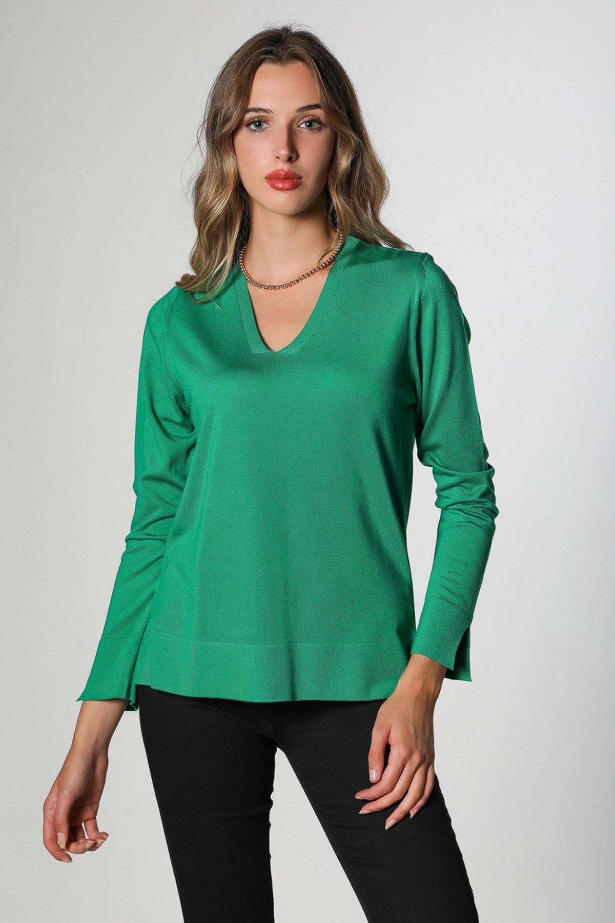V YAKA BİLEK VE ETEK UCU YIRTMAÇLI TRİKO – ZÜMRÜT YEŞİL
