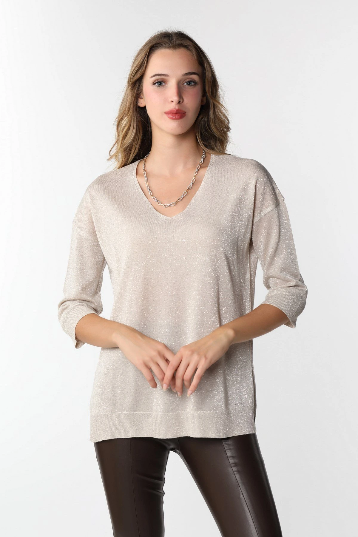 V YAKA BİLEK VE ETEK UCU YIRTMAÇLI TRİKO – EKRU
