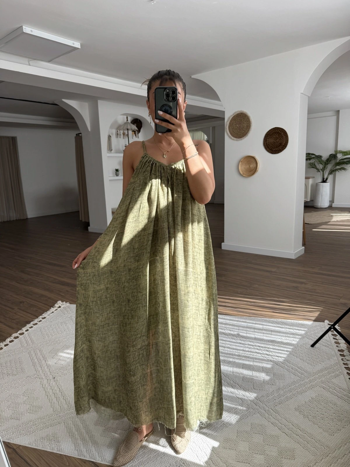 ASKI AYARLAMALI ASTARLI DESENLİ KIRIŞIK VİSKON ELBİSE – HAKİ