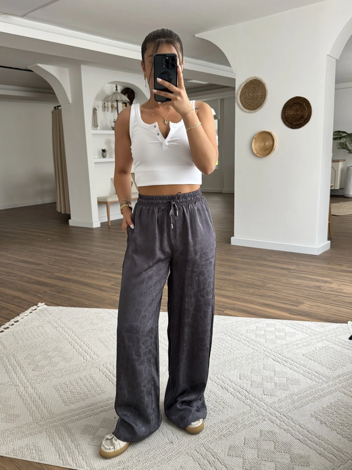 BEL LASTİK CEPLİ DOKU DESEN VİSKON RAHAT PANTOLON – ANTRASİT