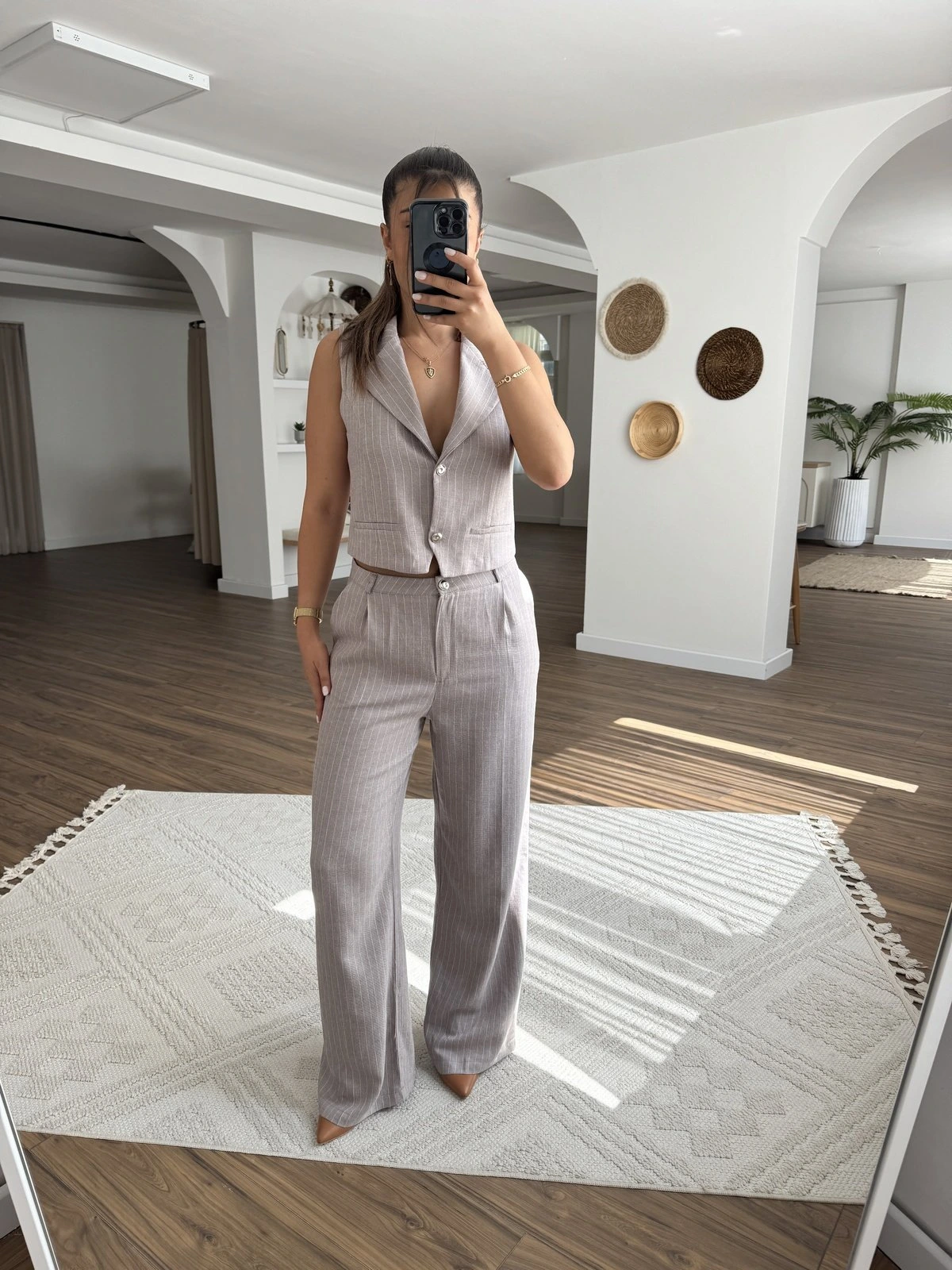 ÇİZGİLİ 2 DÜĞME YELEK PANTOLON PAMUK VİSKON TAKIM – TAŞ