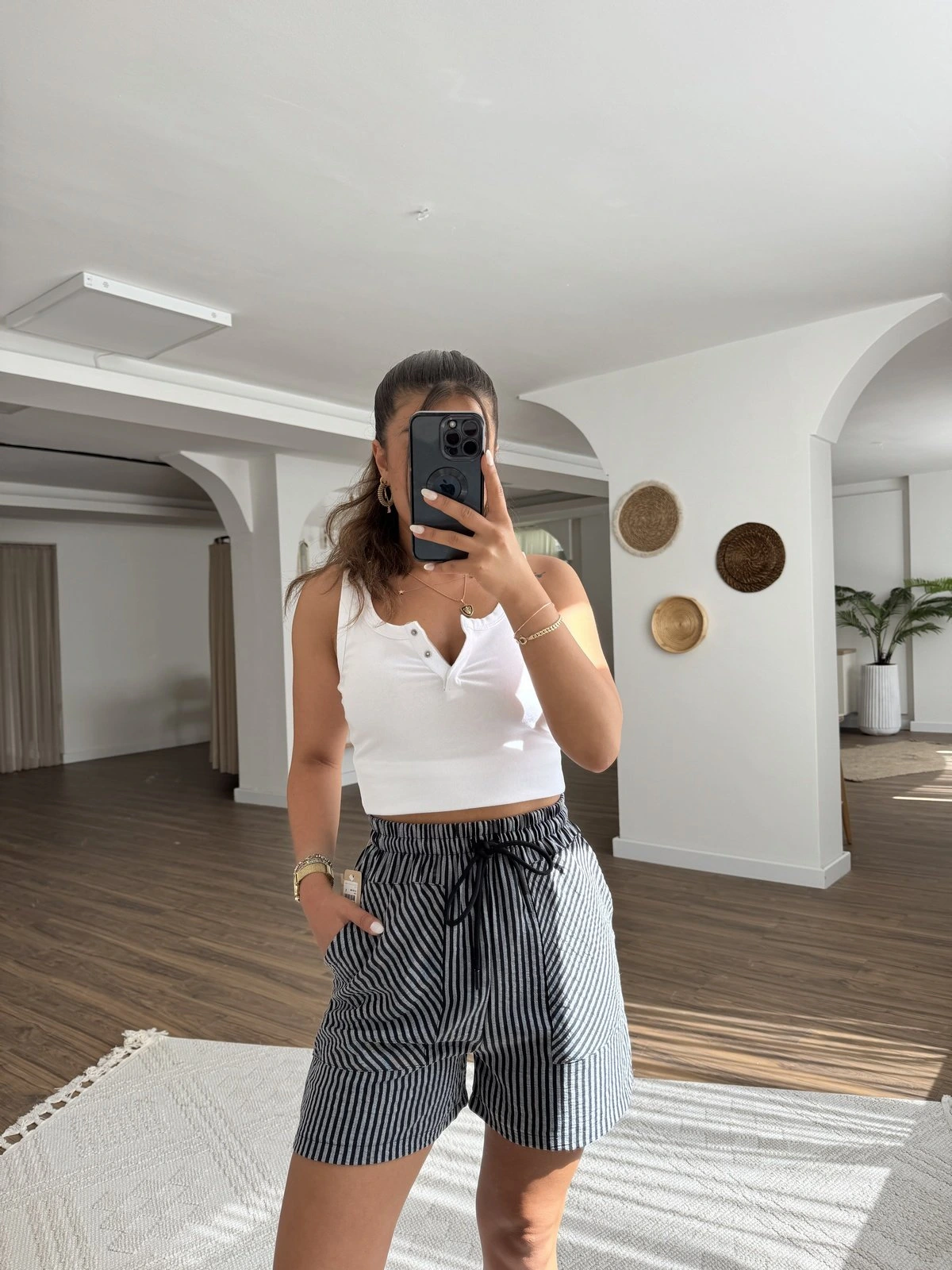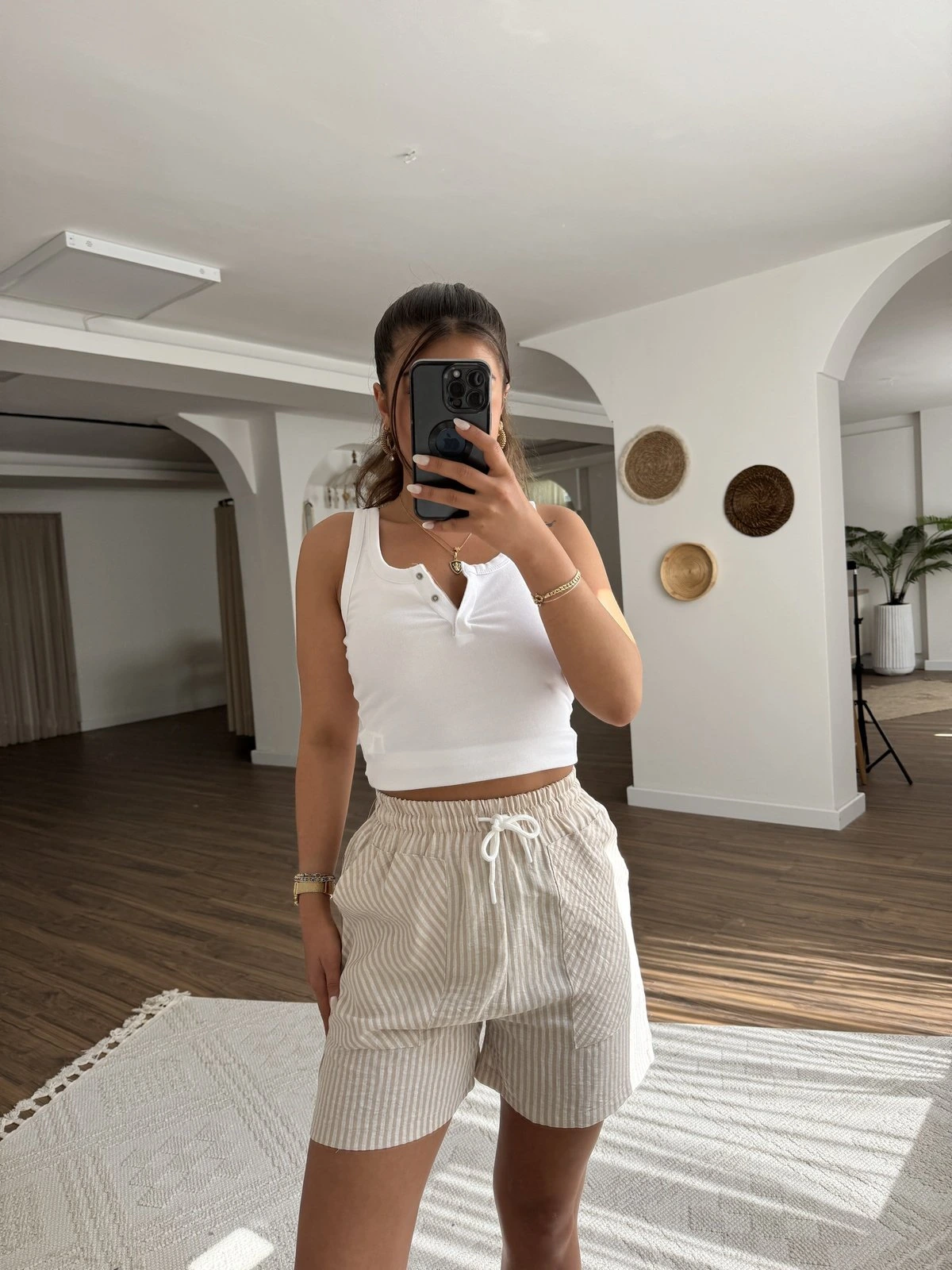 ÇİZGİLİ ÖN CEPLİ PAMUK ŞORT – TAŞ