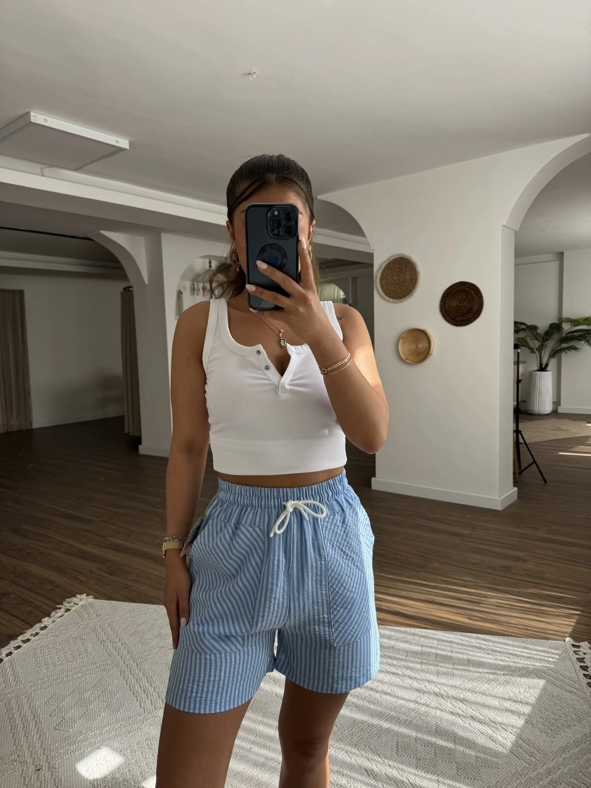 ÇİZGİLİ ÖN CEPLİ PAMUK ŞORT – MAVİ