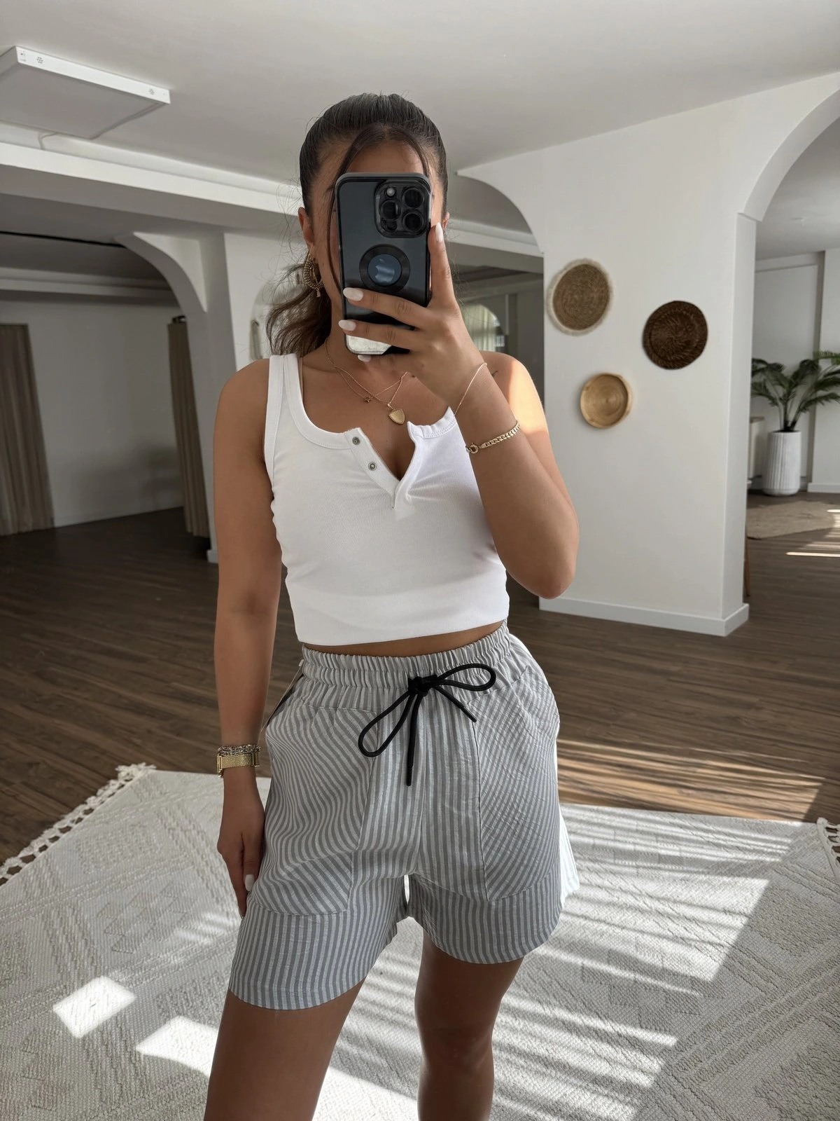 ÇİZGİLİ ÖN CEPLİ PAMUK ŞORT – GRİ