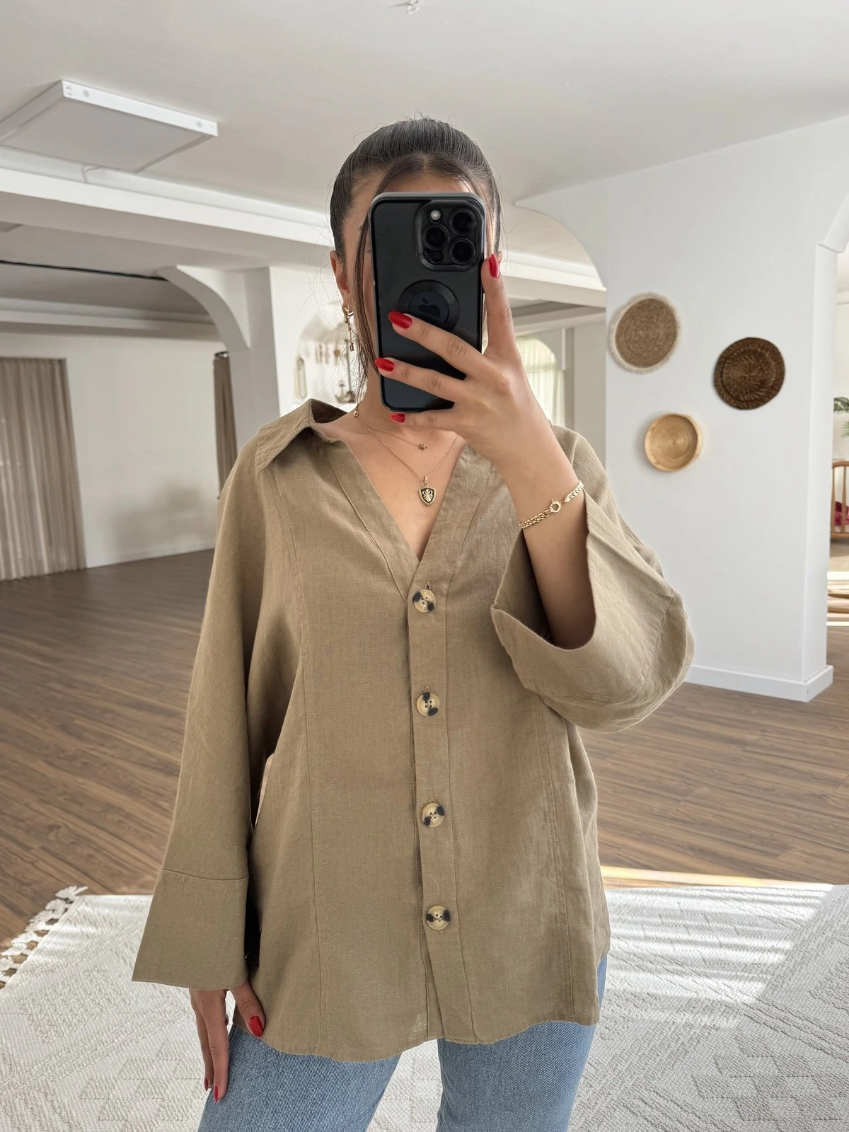 GENİŞ V YAKA KEMİK DÜĞME HAM KETEN GÖMLEK – TOPRAK