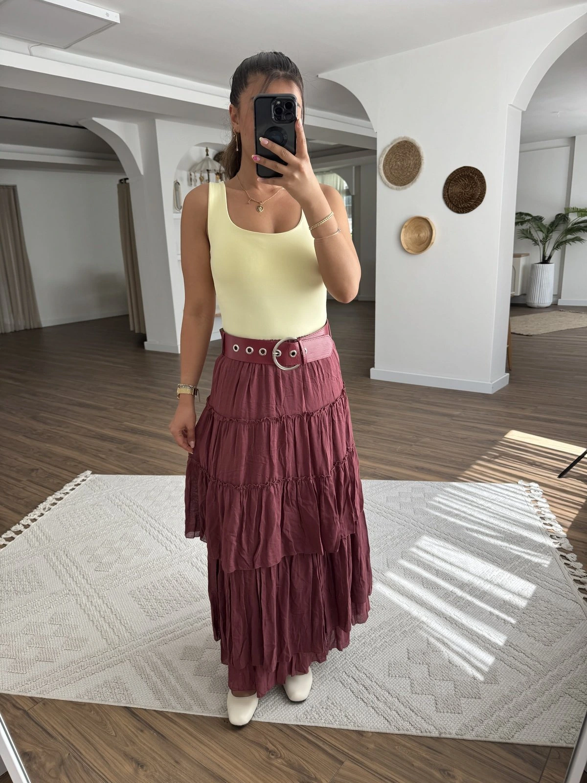 KATLI TERS DİKİŞ TAM BOY ASTARLI KEMERLİ VİSKON ETEK – BORDO