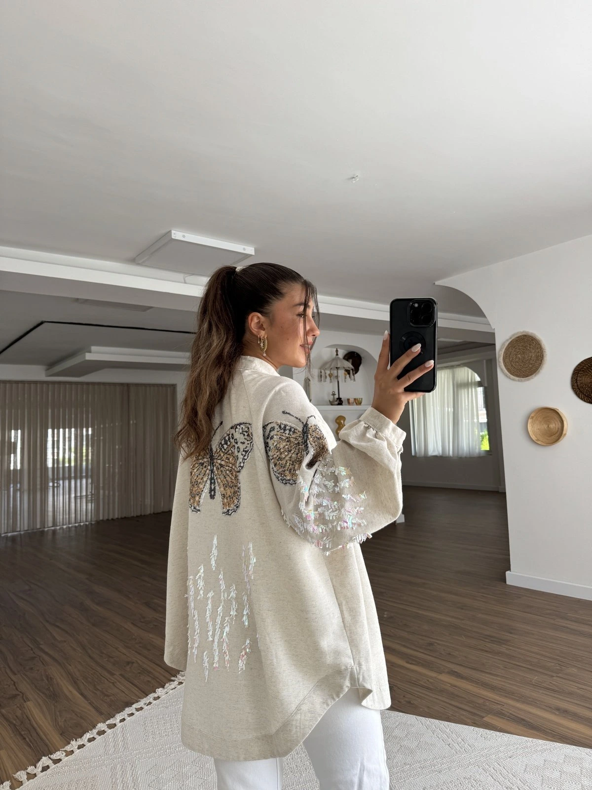 KELEBEK PUL İŞLEME VİSKON KETEN KİMONO – NATUREL