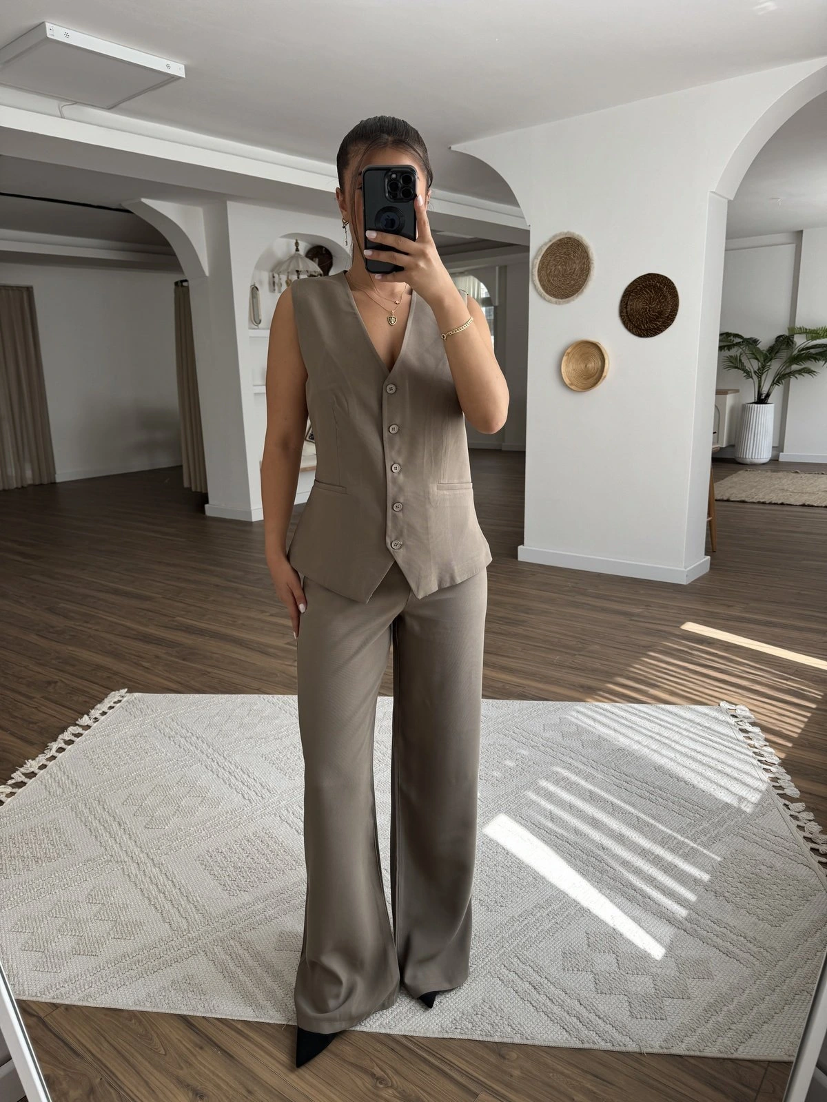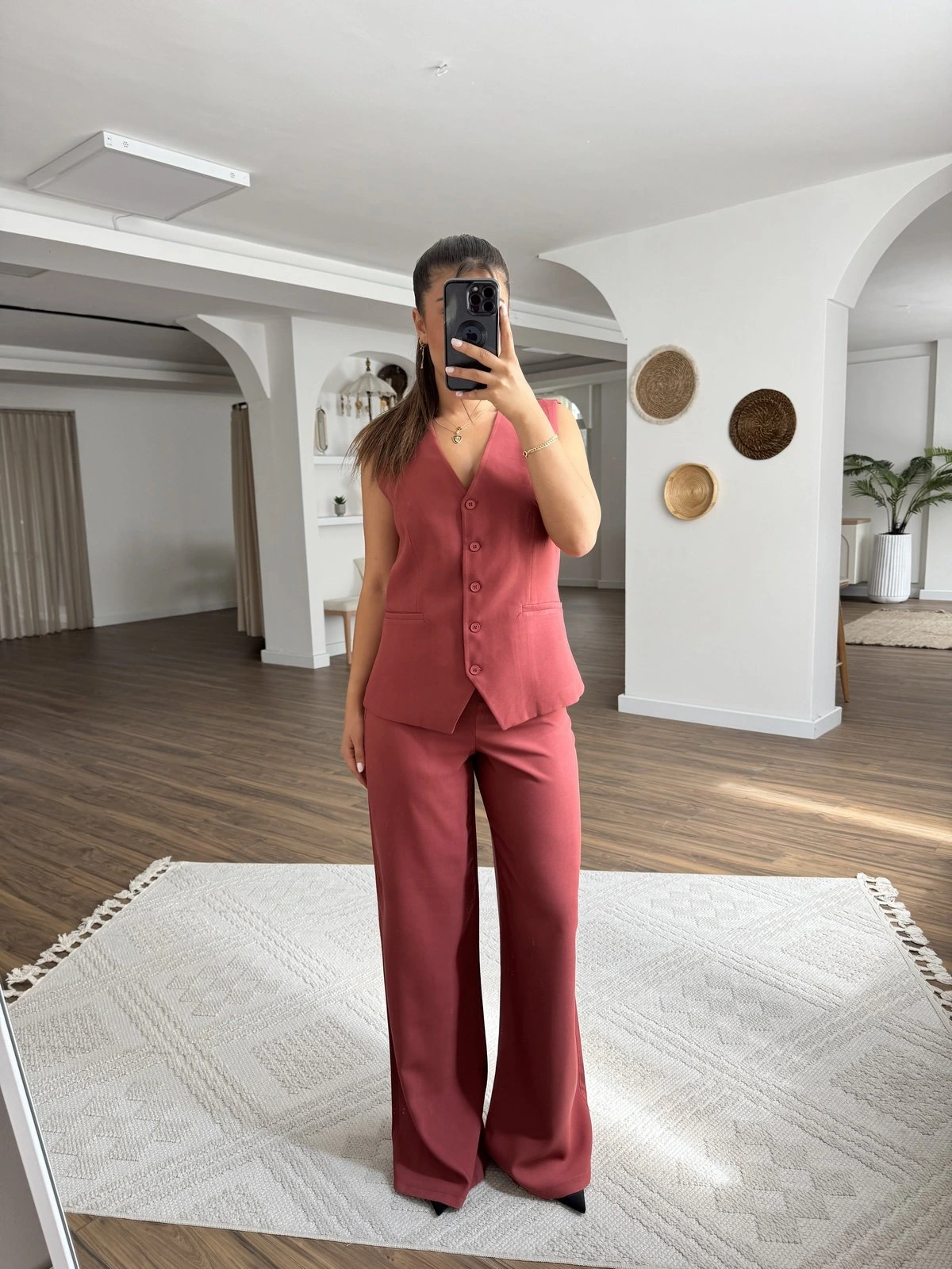V YAKA YELEK PANTOLON TENSEL VİSKON TAKIM – KİREMİT