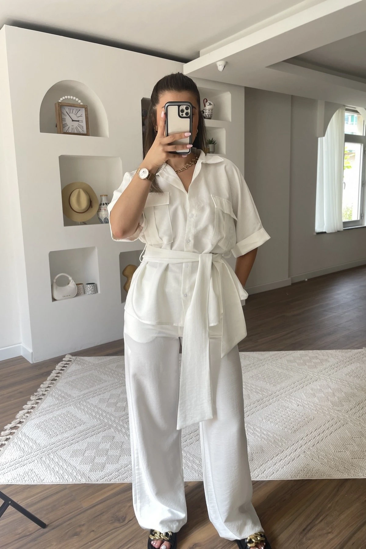 ÇİFT CEP ARKA YIRTMAÇ BAĞCIKLI GÖMLEK PANTOLON PAMUK TAKIM – BEYAZ