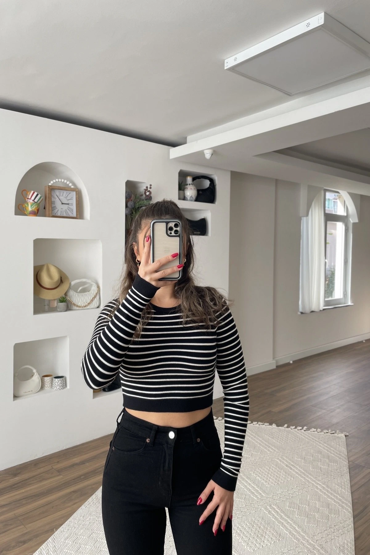 ÇİZGİLİ BİSİKLET YAKA VİSKON CROP KAZAK – SİYAH EKRU
