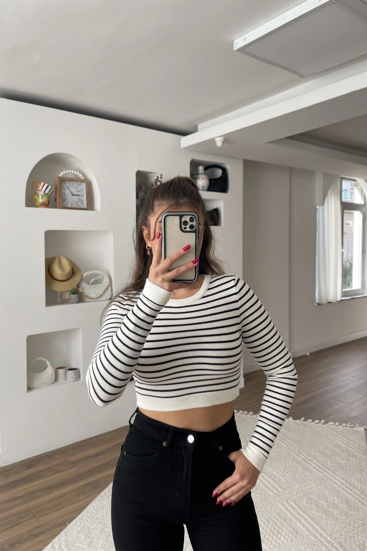 ÇİZGİLİ BİSİKLET YAKA VİSKON CROP KAZAK – EKRU SİYAH