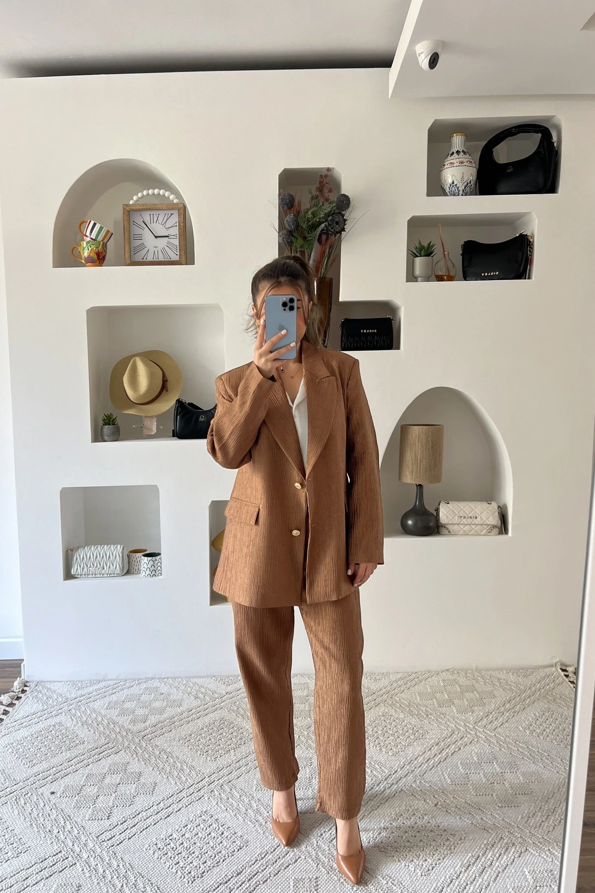 DOKULU VİSKON KUMAŞ HAVUÇ PANTOLON PARILTILI TAKIM – BRONZ