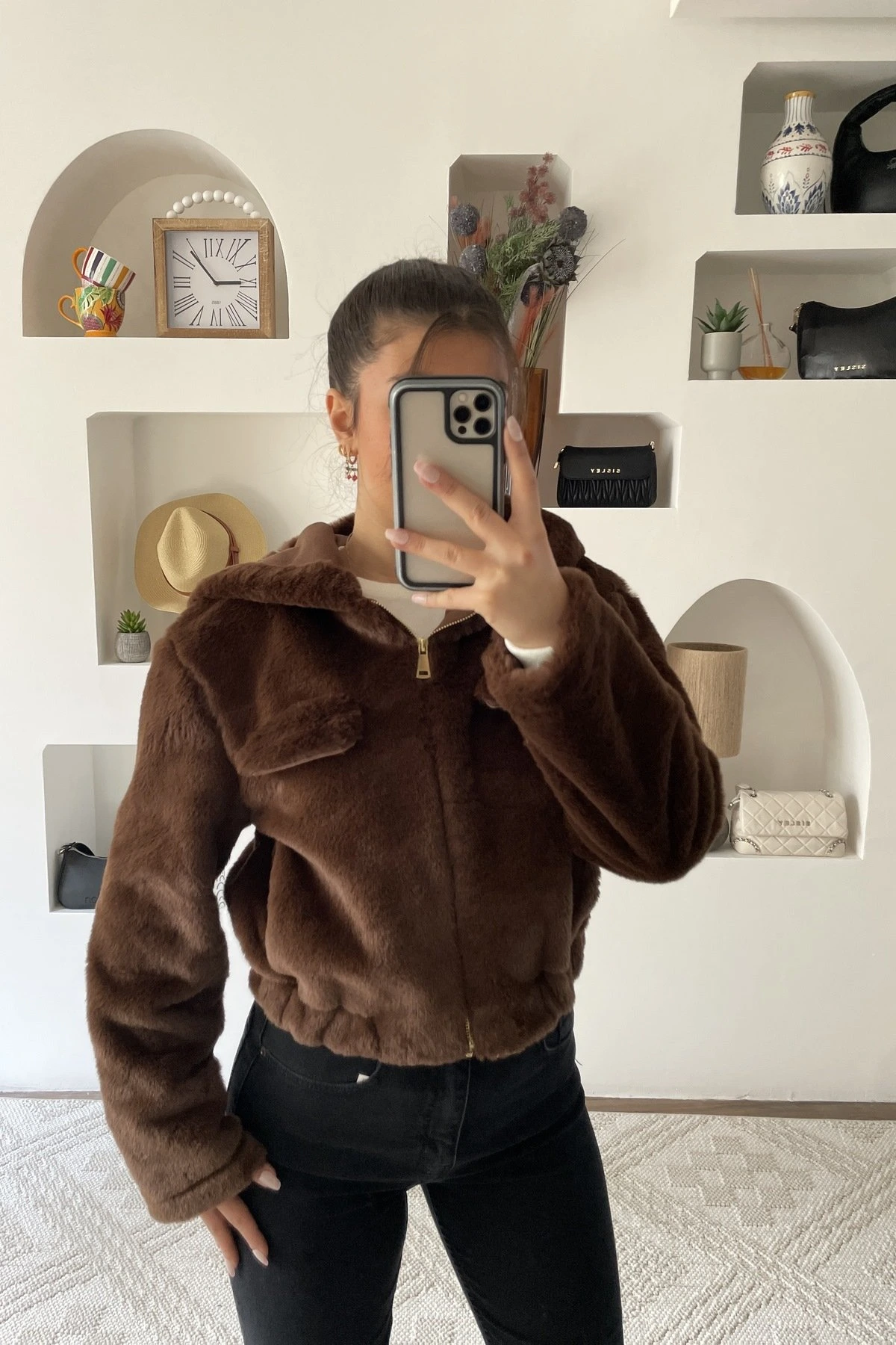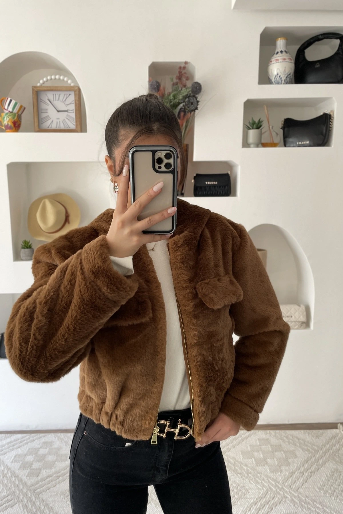 KAPÜŞONLU YAN CEPLİ BEL LASTİK PELUŞ MONT – KAHVE