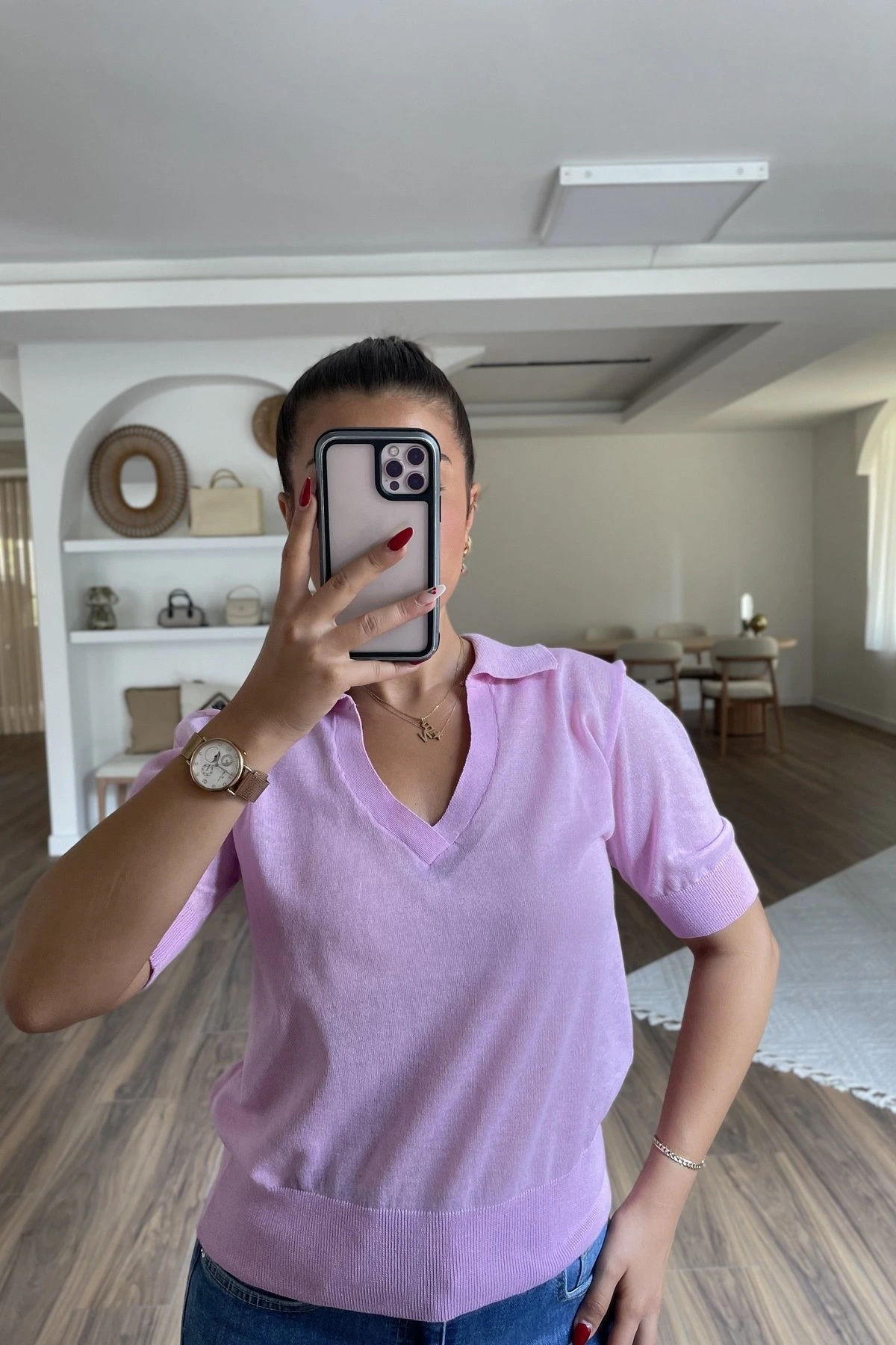 POLO V YAKA İNCE TRİKO BLUZ – PEMBE