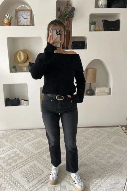 KOL İP PÜSKÜÜL SELANİK DOKUMA BİSİKLET YAKA KAZAK – SİYAH