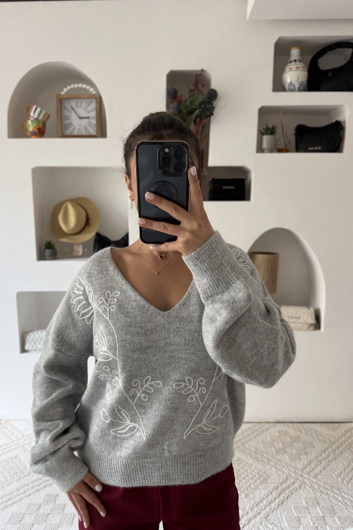 V YAKA MAKROME İP ÇİÇEK İŞLEME KAZAK – GRİ