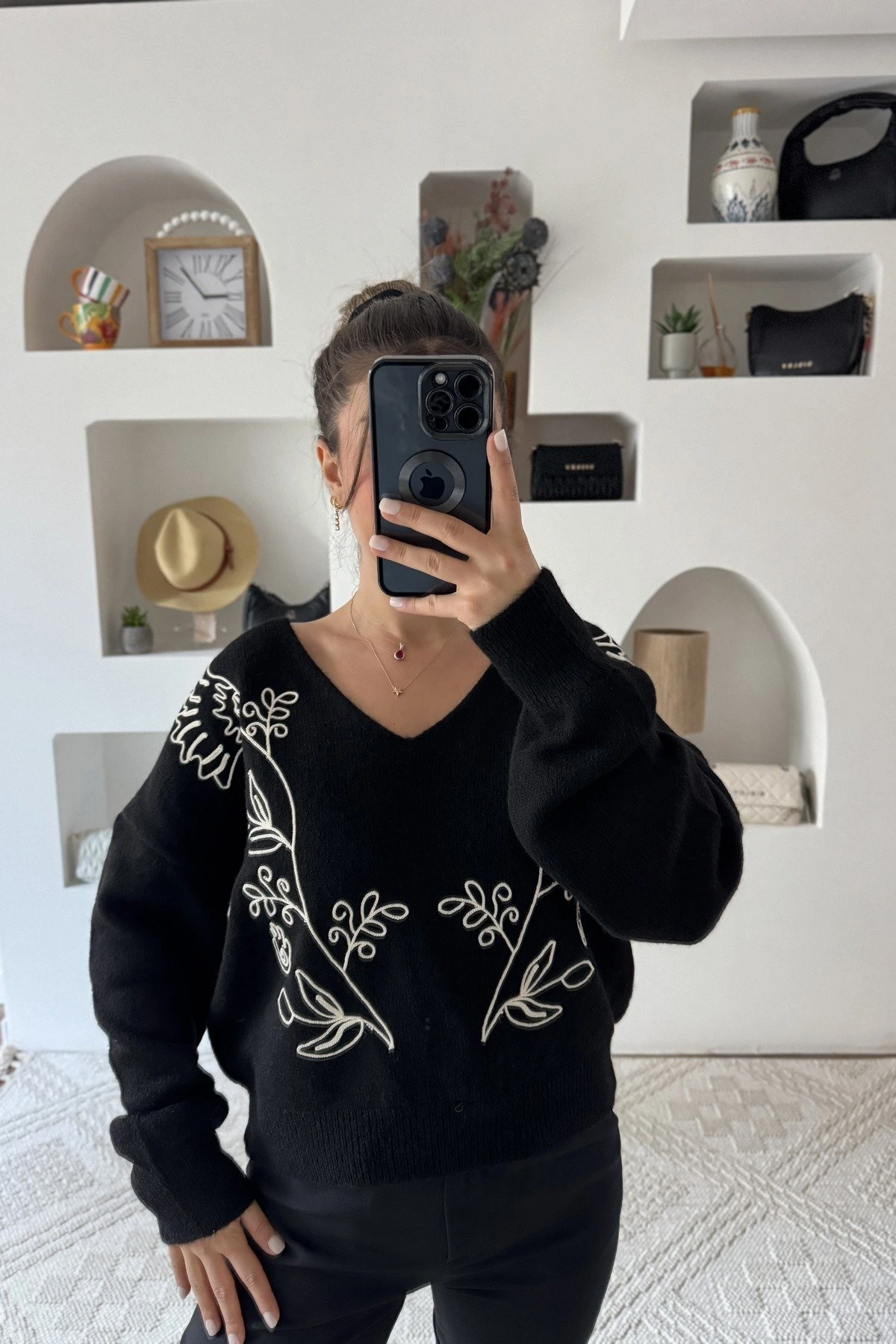 V YAKA MAKROME İP ÇİÇEK İŞLEME KAZAK – SİYAH